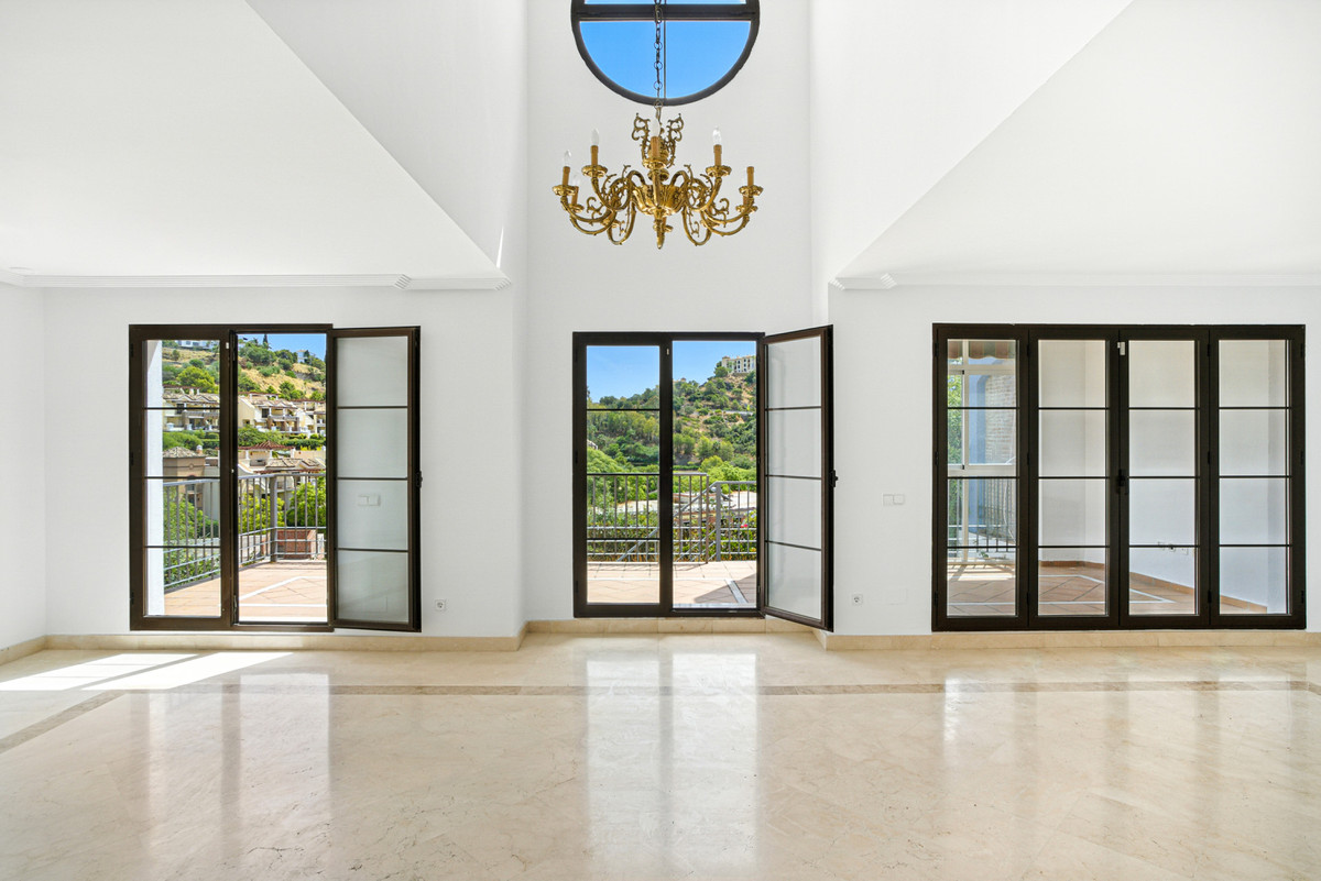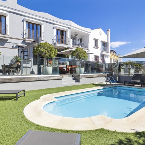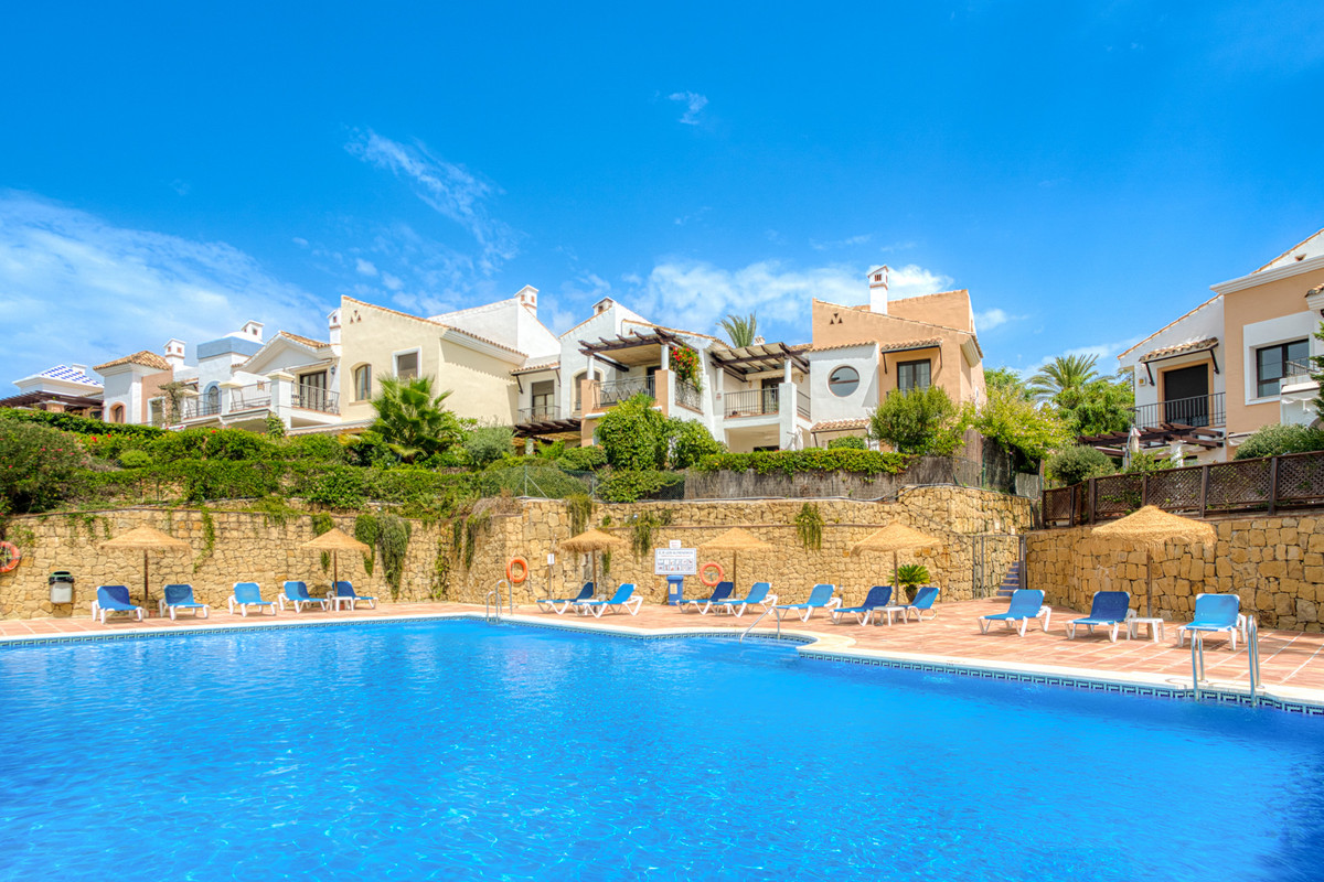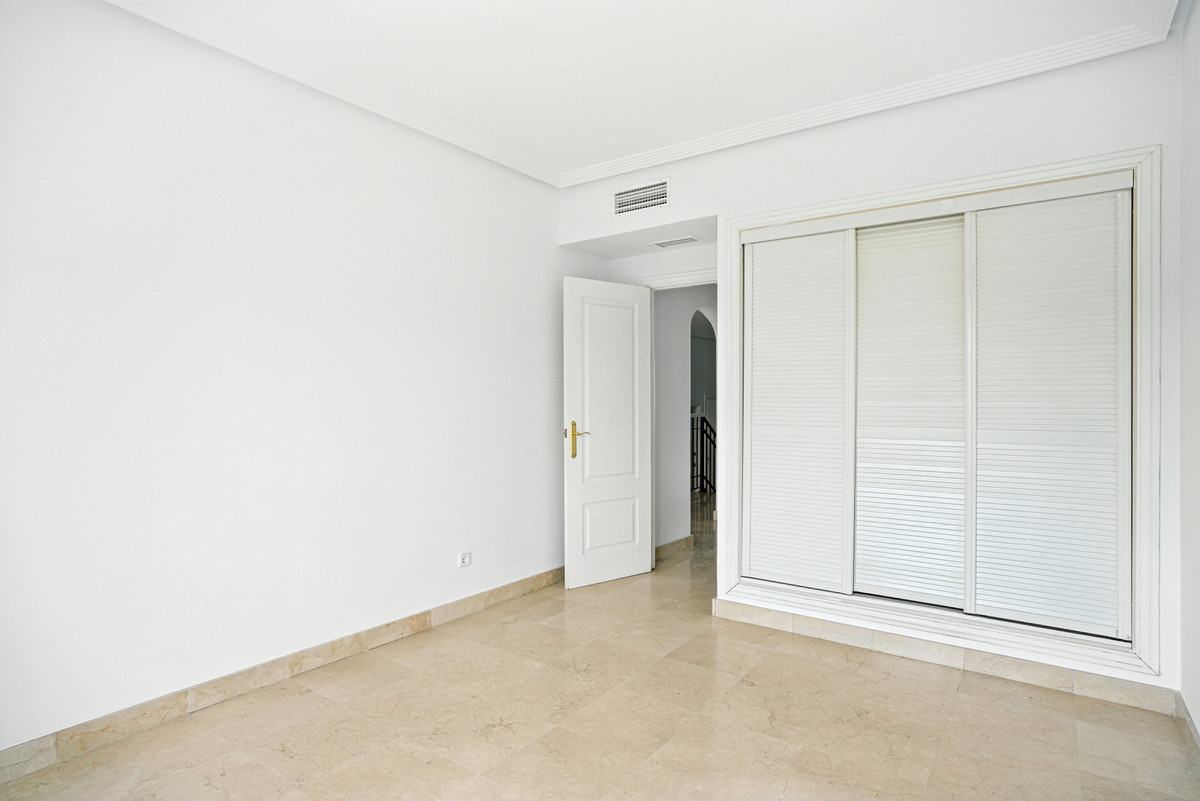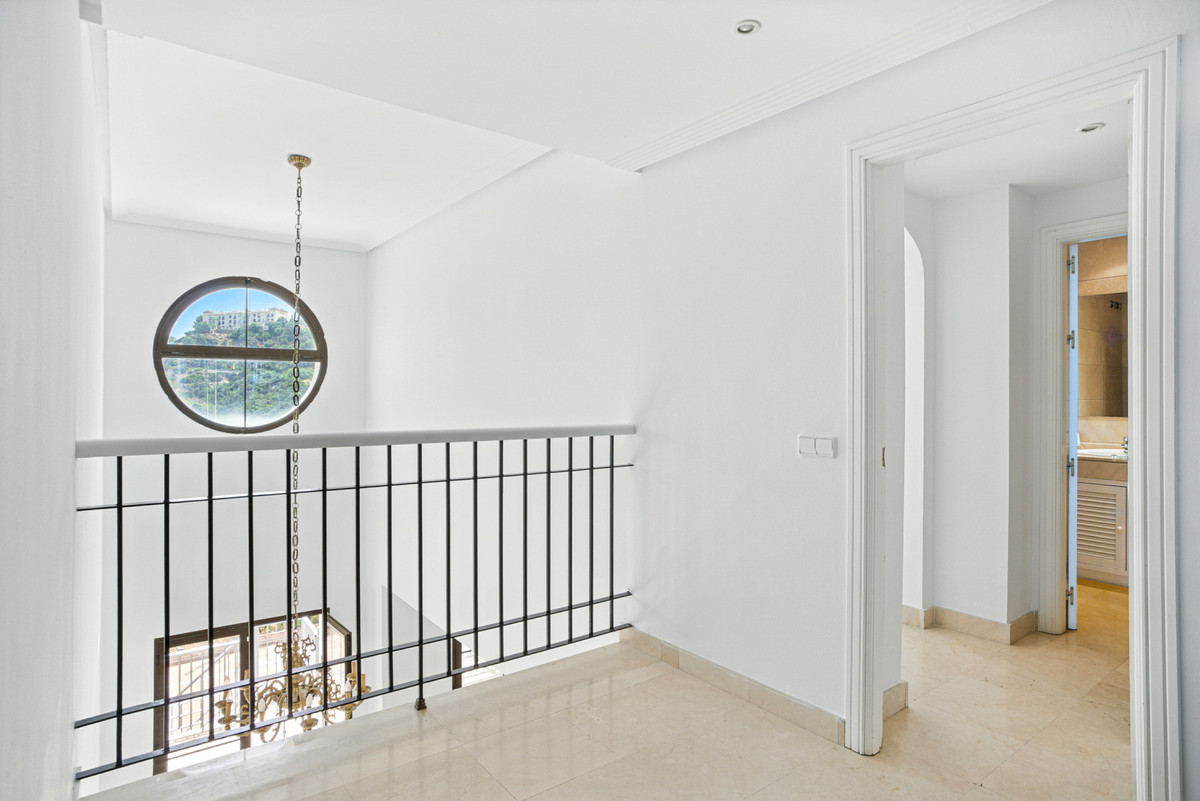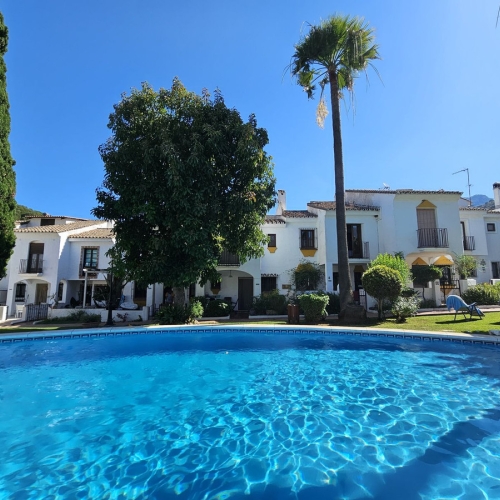 Detta eleganta radhus är undangömt i lugn och exklusiv gated community av Los Almendros, en del av den berömda Los Arqueros Golf gemenskap, och erbjuder exceptionell potential att skapa ytterligare sovrum tack vare sin generösa layout. Spanning tre mångsidiga golv, har hemmet omfattande terrasser, en privat trädgård och spektakulär utsikt över landet, med frodiga gemensamma trädgårdar och två pooler som ger en lugn bakgrund samtidigt som de ligger nära La Quinta, San Pedro de Alcántara och en kort bilresa från Marbella. Huvudvåningen innehåller en rymlig lounge med eldstad, matplats, fullt utrustat kök med tvättstuga och ett extra rum med badrum idealiskt som ett kontor eller extra sovrum, allt som flyter ut till en stor underhållande terrass. På övervåningen är tre välstora sovrum, inklusive en mästare svit med privat terrass och två gäst sovrum som delar ett familje badrum. Den naturligt ljusa källaren, med oberoende tillgång erbjuder utmärkt flexibilitet för att skapa en gästlägenhet, hem gym, ytterligare sovrum eller gott om förvaring. Ytterligare funktioner inkluderar monterade garderober, privat garage för en bil och luftkonditionering hela.