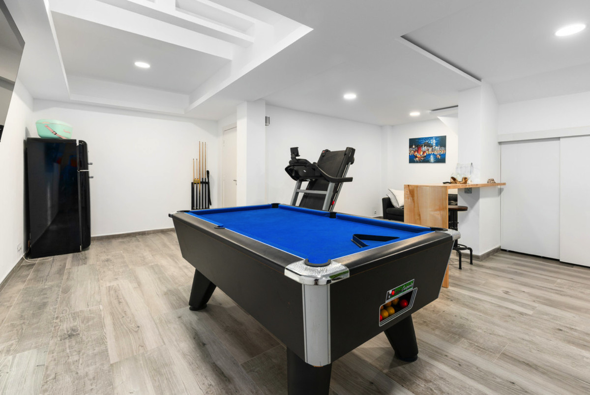 This level offers two additional double bedrooms with fitted wardrobes, one of which includes an en-suite bathroom. A second bathroom serves the remaining bedroom. A large games and chill-out room with a pool table provides the ideal space for family fun and entertainment. The property also includes a substantial storage room and offers potential to extend the basement by an additional 60m².
