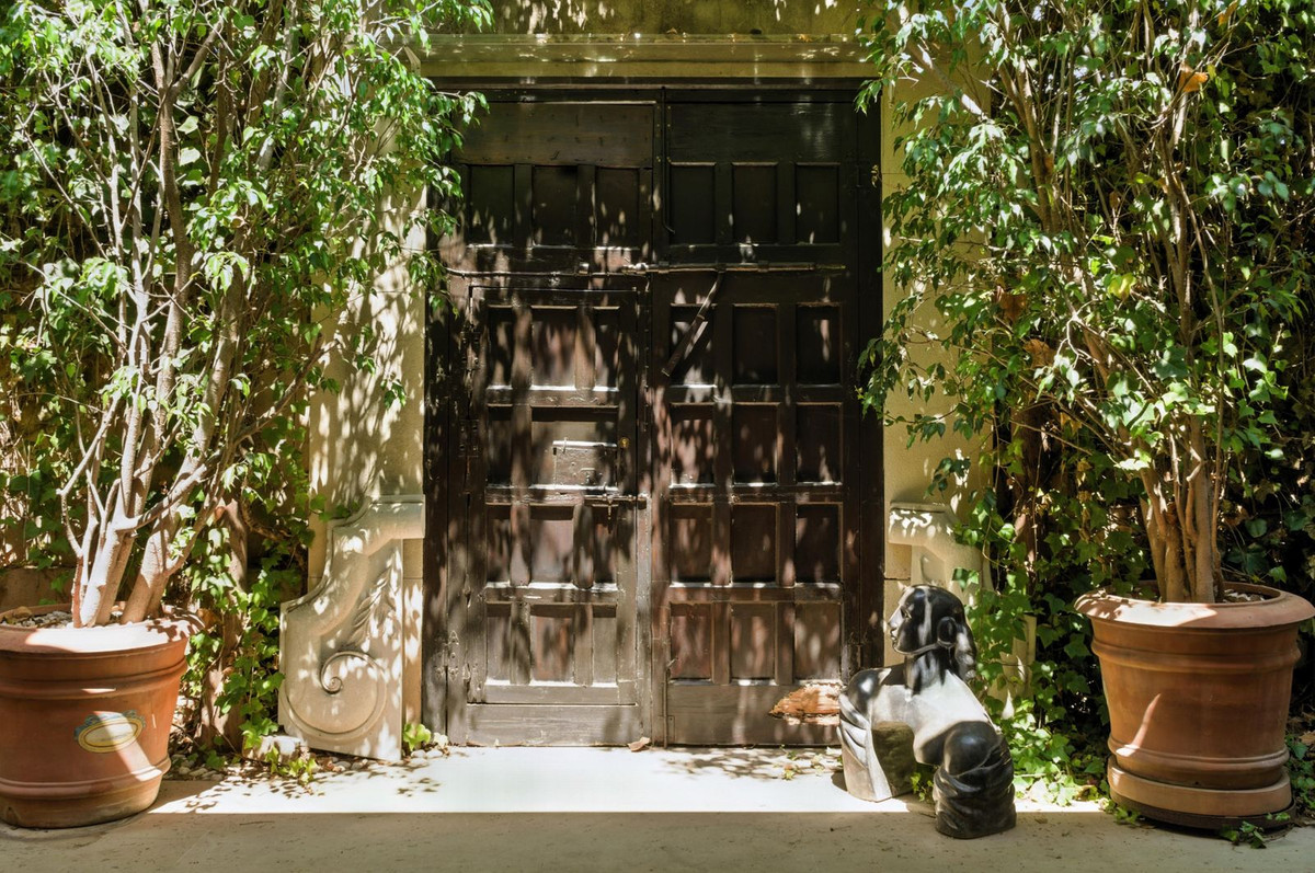 The exterior is equally impressive, featuring mature gardens with large perimeter trees that provide privacy, natural stone elements throughout — including columns, staircases, fireplaces, and fountains — and beautifully landscaped areas with a private ornamental pond and decorative obelisks. The grand natural stone entrance and antique wooden front door further emphasize the home's distinctive Andalusian character.