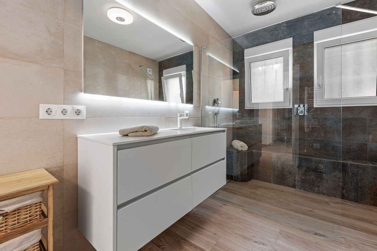 The front door opens into a bright living dining room with an open plan kitchen, where the Mediterranean sea views immediately catch the eye. A large picture window and double glass doors connect the interior with the partially covered terrace outside. The modern, fully equipped kitchen also enjoys the same spectacular views. The staircase to the lower floor is located on this level.