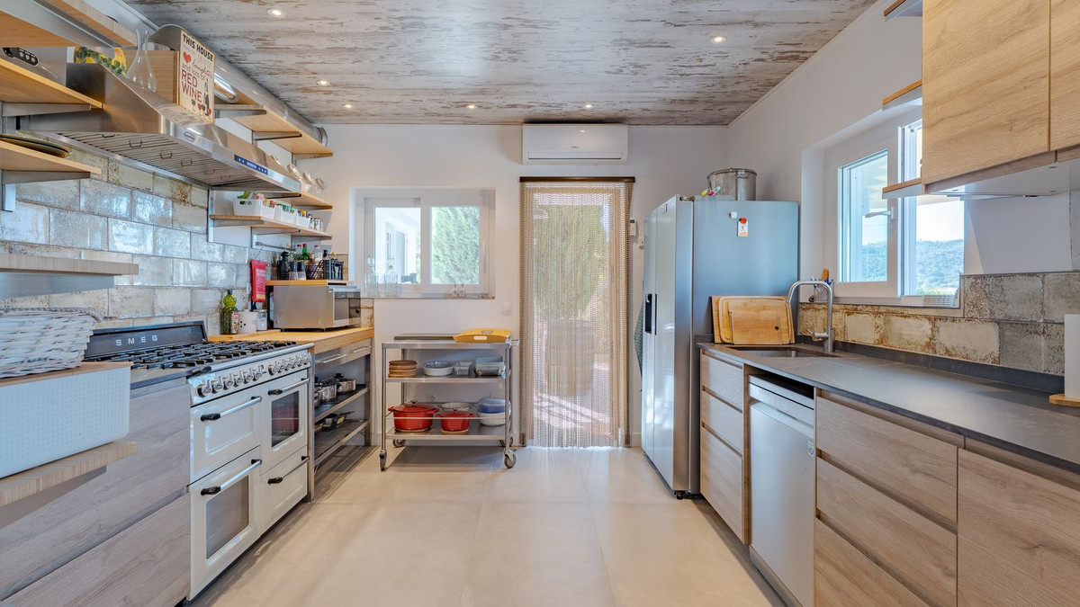 Fully renovated to the highest standards, the villa offers three stylish bedrooms and two elegant bathrooms. Inside, you will find modern comforts such as underfloor heating and cooling, a pellet stove, and solar panels with expandable battery storage. Thanks to the advanced water purification system, you can drink straight from the tap – no more bottled water needed. Note: The energy certificate is ready for the new 2030 standard.