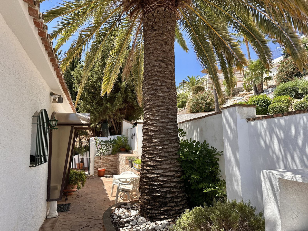Features the master bedroom with en-suite bathroom and views over the pool, plus an additional en-suite bedroom. A lounge area, currently used as an office, sits between the two bedrooms and opens directly onto the pool area, a covered terrace, and a sun-drenched uncovered terrace that leads to a large plot filled with a variety of fruit trees.