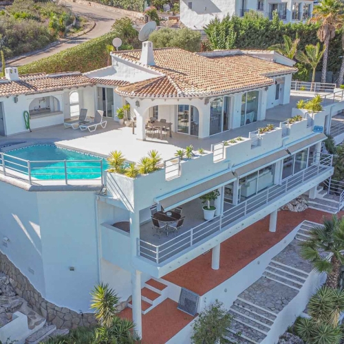This magnificent villa offers breathtaking views of the Mediterranean Sea and the mountains. Distributed over three floors, the ground floor, at street level, houses the main living area, which has a spacious living room, a fully equipped kitchen with island, 3 bedrooms and a complete bathroom en suite. An external staircase leads to the upper floor, where there is a spacious bedroom with en suite bathroom and a terrace with panoramic views, making this space an ideal place for entertaining, relaxation or even as a work area. The same staircase also leads down to the lower level, where the swimming pool and chill out area are located. Here, there is a laundry area next to a bedroom that is currently empty, offering numerous possibilities as a gymnasium, wine cellar, storage room or whatever other needs you may have.