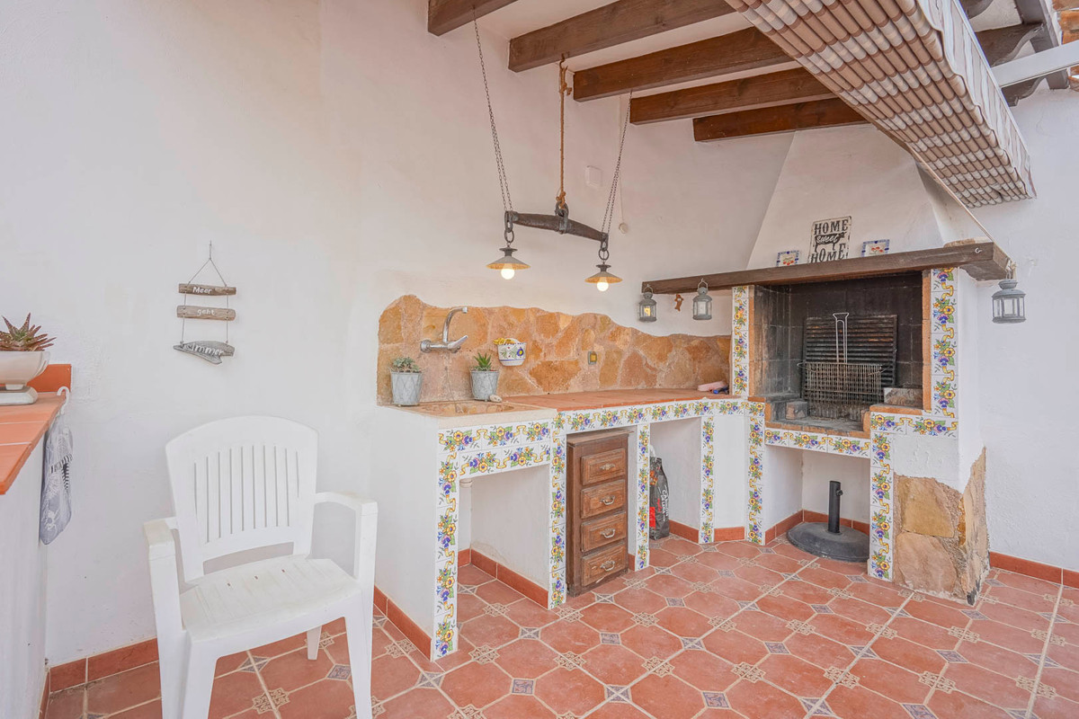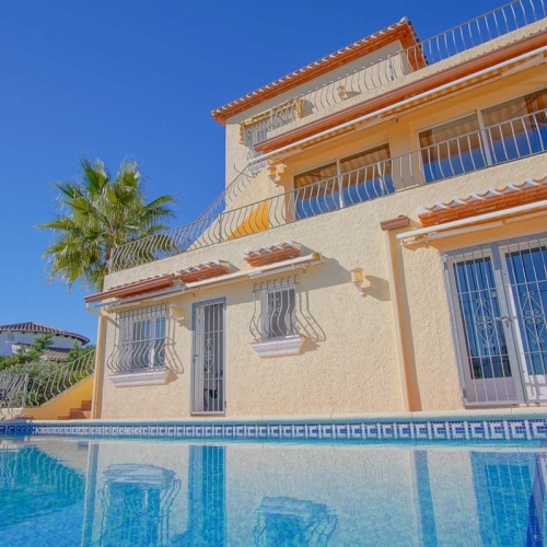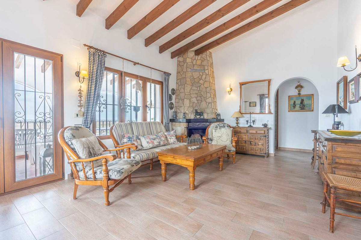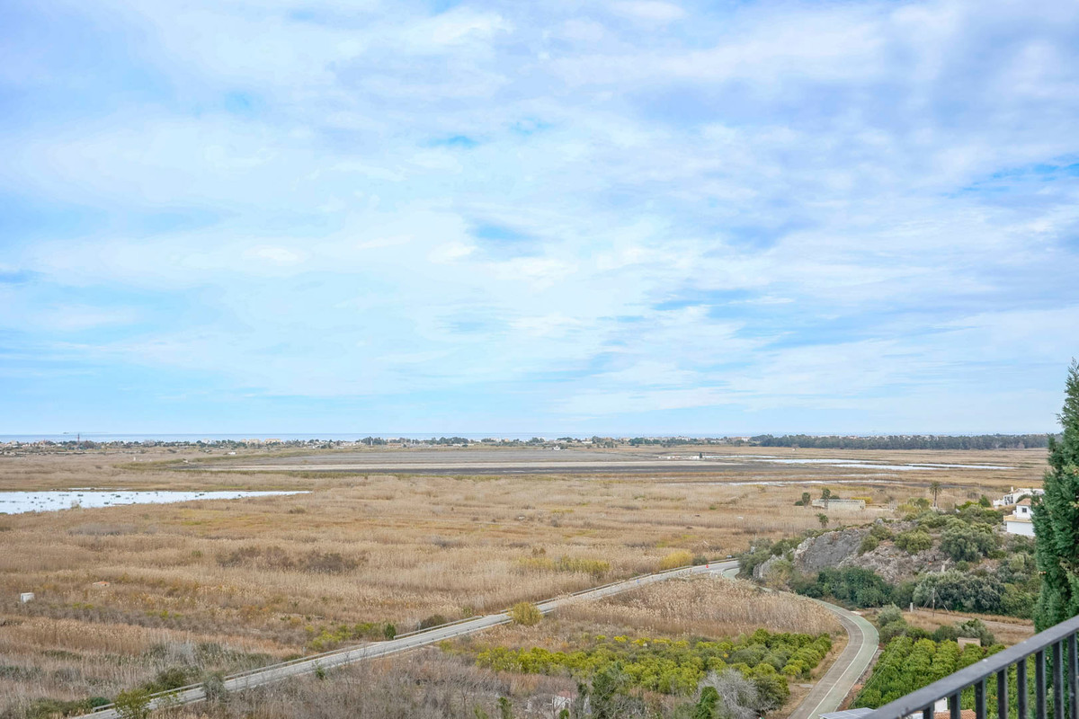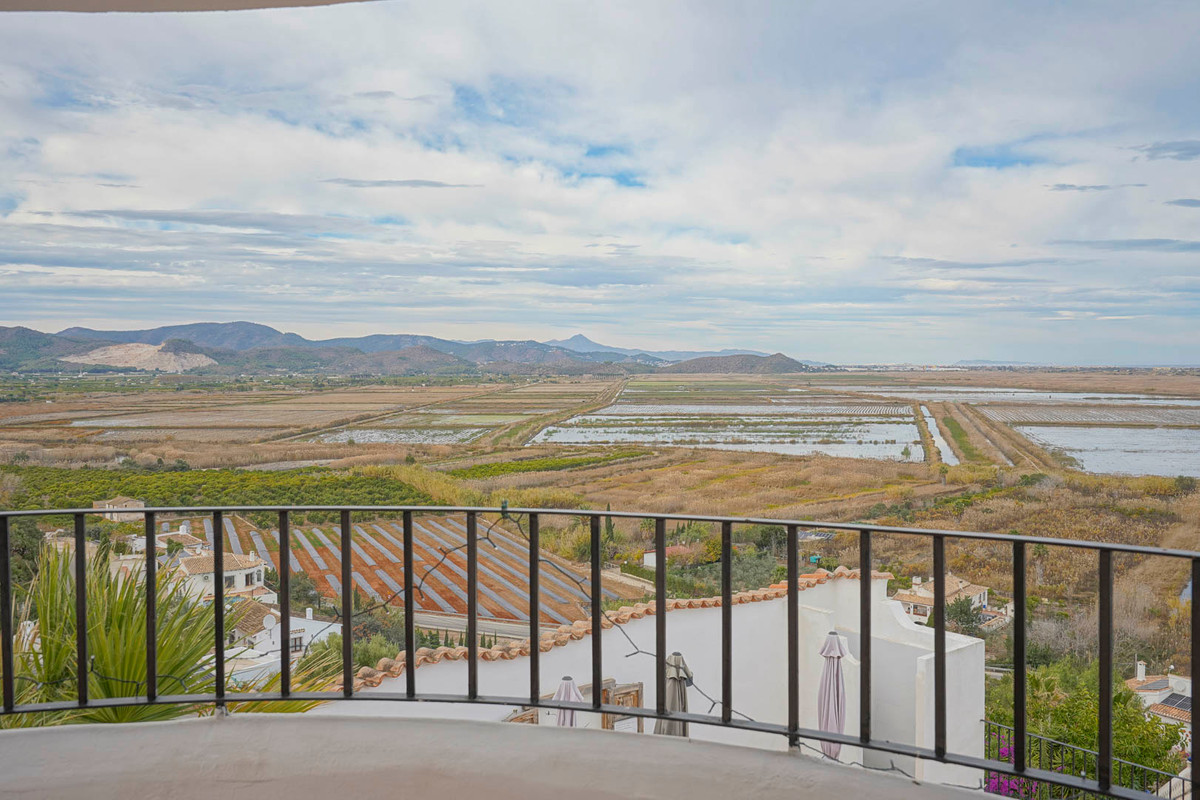 This large, traditional Spanish villa is located in Monte Pego and offers stunning 180º unobstructed views. The views extend from to Pego across the ‘Marjal de Pego' nature reserve and rice fields to the mountains to the west and down to the coast, with coastal towns of Oliva to the northwest and Denia to the east. The villa consists of two floors and has a separate guest house connected to the main house. Through a very spacious driveway of up to 280 m2, surrounded by plants and trees, you reach the villa and the garage. Both the villa and the garage are one step higher and the driveway has four water drains so you will never have water in your house during heavy rainfall. Thanks to the elevated driveway, you have the luxury of parking your car right in front of the door and entering your house with only one step. An exception for Monte Pego where most houses can only be reached by stairs. You enter the property on the first floor where the main house is located. This consists of a lounge with a fireplace, a dining room with a dining table for 8 and a renovated massive, open-plan kitchen with a new fridge, dishwasher, cooker and oven. There are also two double bedrooms, a renovated bathroom and a renovated guest toilet. Outside is a very large covered terrace of about 20 m2 and a patio with a barbecue and an outdoor kitchen with hot and cold water. An awning has also been installed to provide shade. An external staircase leads to the pool area, which is completely private and not overlooked by any house. The 4 x 8 m pool is surrounded by a large terrace with space for several sunbeds and an outdoor shower with hot water. You can also enjoy the unique views from the pool. On this floor there are two more double bedrooms, a bathroom and an extra room. (This floor is only accessible from outside). There is also an 18 m2 storage room for pool and garden equipment. Adjacent is the guest house terrace with a second outdoor shower also hot/cold. The guest house is connected to the main house by a corridor and consists of a kitchen and lounge on the first floor and a double bedroom, a very spacious bathroom designed by Luigi Colani and a guest toilet on the ground floor. The bathroom has electric underfloor heating. There is the possibility of converting the garage of almost 30 m2 on the first floor into a living room, thus extending the guest house. The guest house has a private entrance in addition to the entrance via the main house. All bedrooms and living room have heating. In addition, several renovations to the villa have been carried out in recent years. For instance, the entire villa has been double-glazed and all windows and doors have been renewed with plastic window frames in wood design, mosquito windows have been installed in all bedrooms and new flooring has been laid both upstairs and downstairs, air conditioning has been installed in all bedrooms, living room and kitchen and the electrical installation has been renewed.                          Outside, almost 220 m2 of new tiles have been laid including the covered terrace, patio and pool terrace. The renovation has kept the Castilian style, which makes the villa unique. The villa is surrounded by an easily maintained garden with automatic irrigation and has another small terrace facing south. Underneath the villa is a lighted cellar giving you access to all the pipes running under the house. All doors and windows have bars. Included in the price are all furniture, including bedding, crockery, etc. The two partially visible plots of land at the foot of the house are designated ‘green zone', meaning no building is allowed on them. A very quality villa at a good price with stunning views. Do not hesitate any longer and request your visit! Plans of the villa on request.