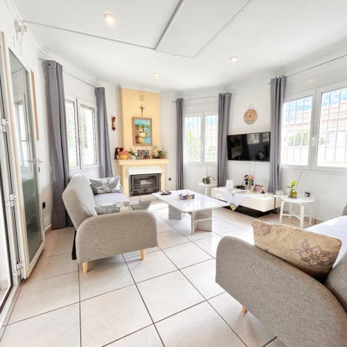Outside, a well-kept Mediterranean garden with natural grass, a private pool, a barbecue area, and an outdoor toilet invite you to enjoy the Costa Blanca climate. The fully fenced plot includes parking for several vehicles. The villa has central heating, ducted air conditioning, marble floors, double-glazed exterior carpentry, and an alarm system.