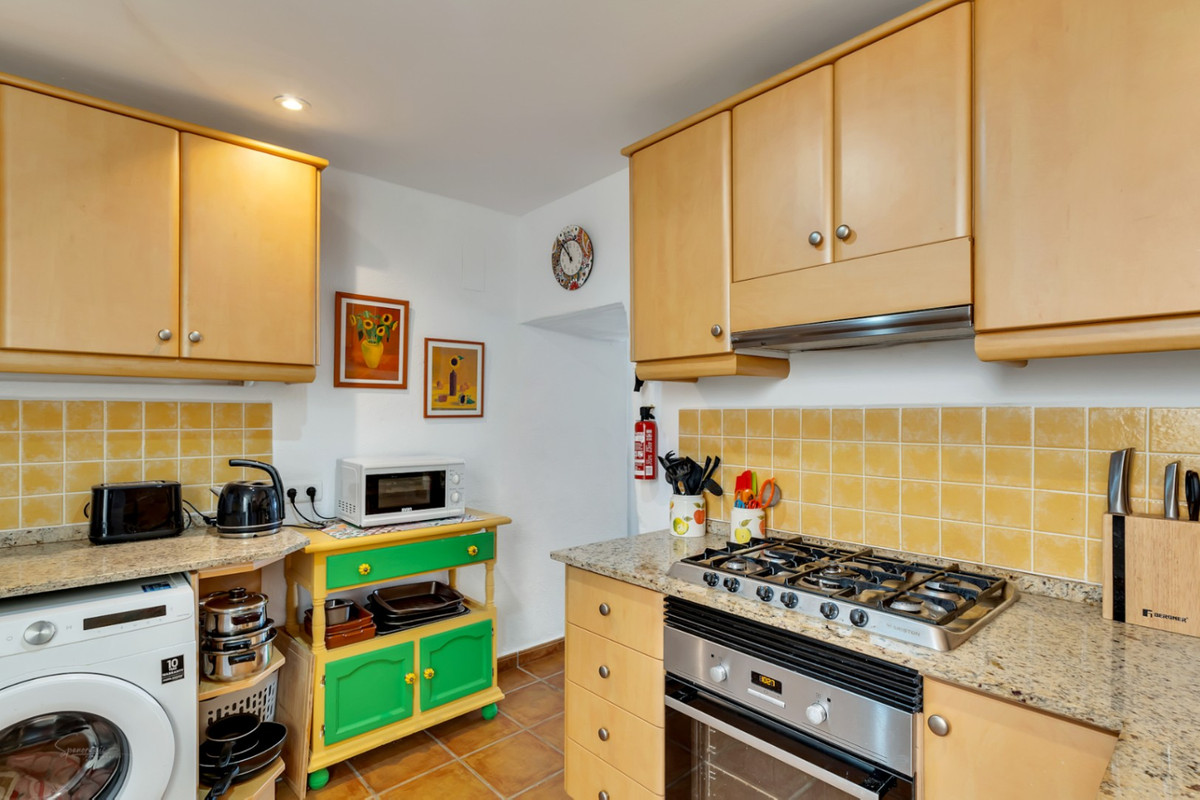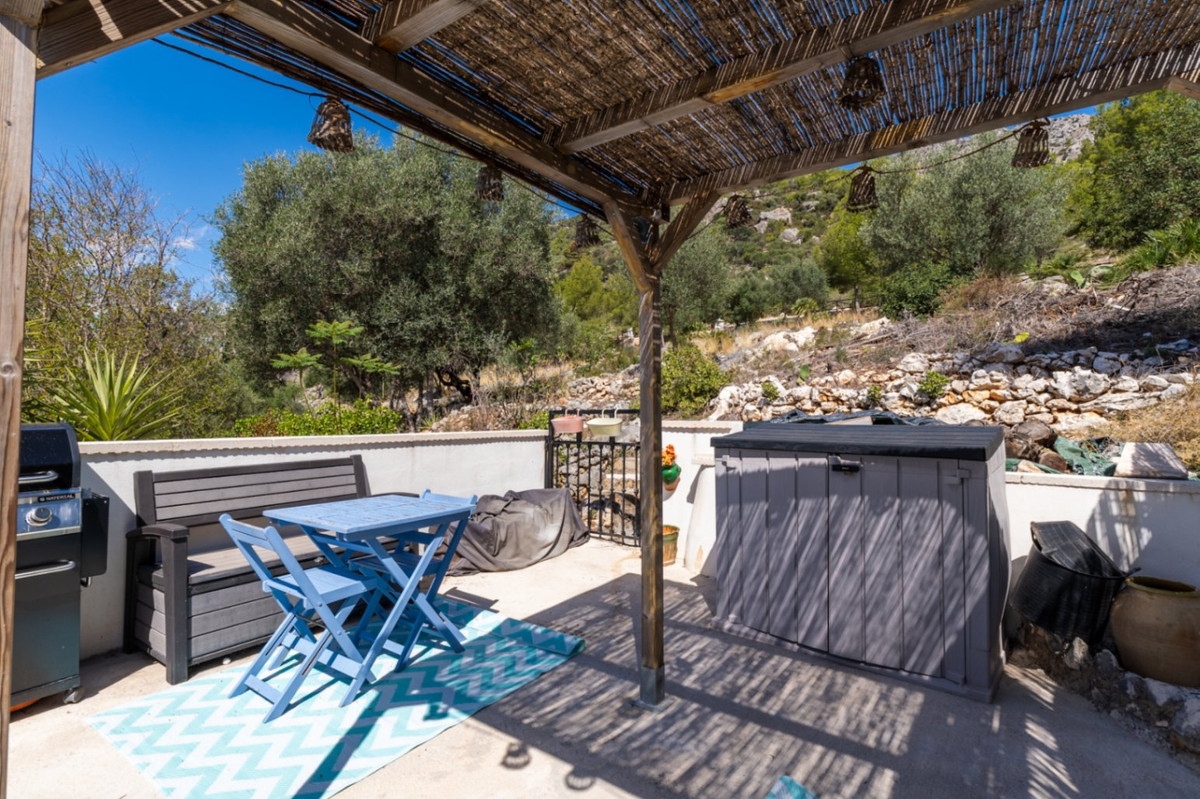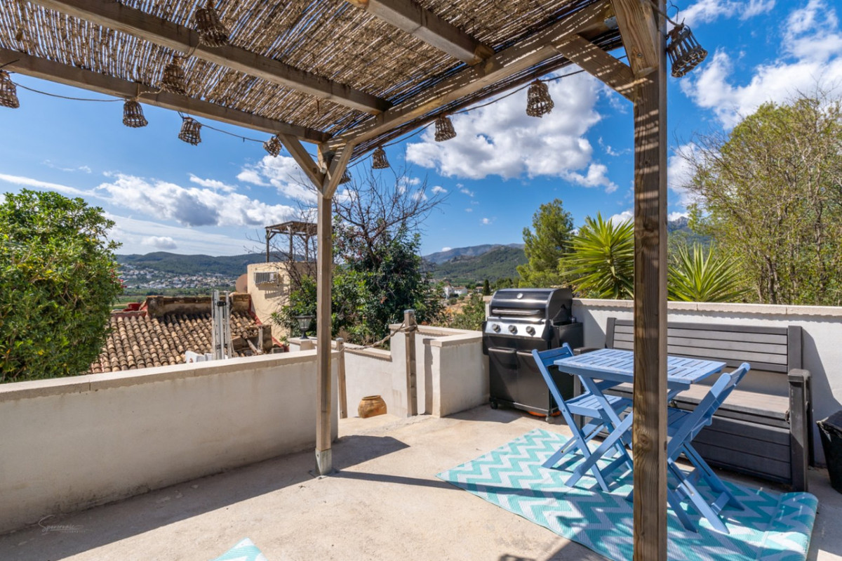From the kitchen, a series of steps lead to two terraces. The first terrace offers a shaded seating area with an awning, perfect for outdoor dining. A few more steps lead to a chill-out space complete with a BBQ area and stunning mountain views. The property enjoys year-round sunshine and complete privacy at the rear, with no buildings behind it.