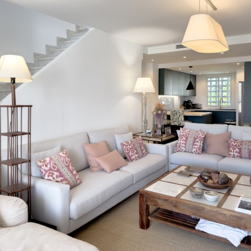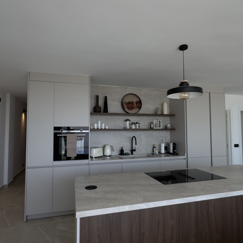 The 82 m² home is located on a corner, providing plenty of natural light and a feeling of spaciousness. It has two large bedrooms, one with sea views and both with built-in wardrobes and small mezzanines for storage, a separate kitchen that can be opened up and integrated into the spacious living room, and a large terrace 15M2 with side sea views and direct views of the communal pool, surrounded by impeccably maintained gardens.