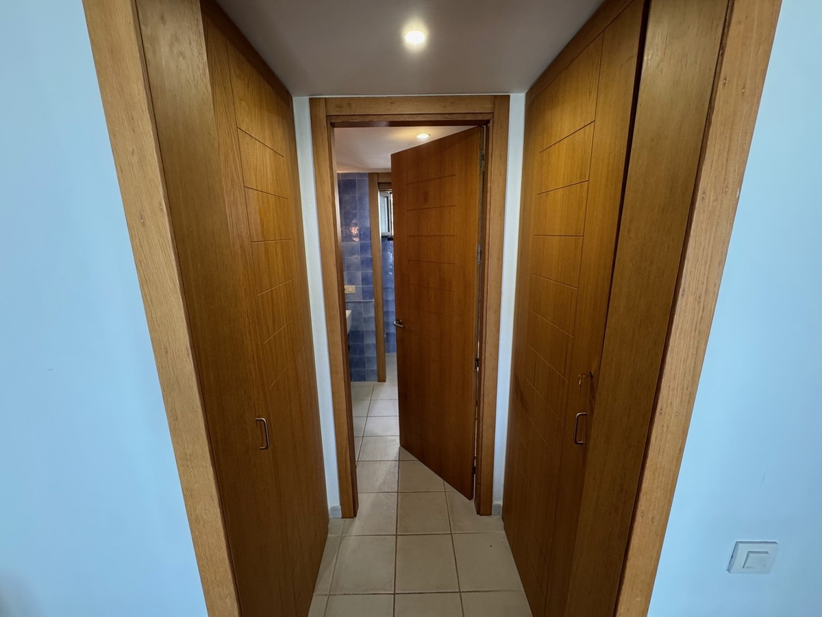 Inside, the spacious apartment opens into an inviting hallway with the fully fitted kitchen immediately to the left. The kitchen features ample storage, vibrant worktops, modern appliances, and an opening through to the bright and airy lounge and dining area. Floor to ceiling sliding doors frame incredible views over the resort, the coast, and the Mediterranean Sea.