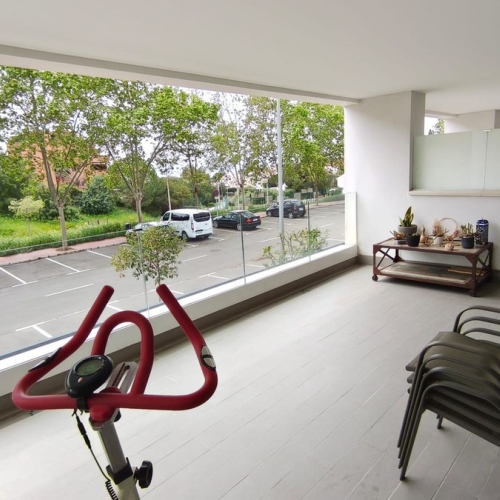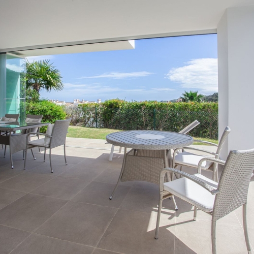Fastigheten ligger på bottenvåningen och har en stor terrass med utsikt mot Parque de Constitucion, samt direkt tillgång till poolerna och gemensamma trädgårdar. Det finns ett stort, fyrkantigt vardagsrum med franska fönster ut mot terrassen.