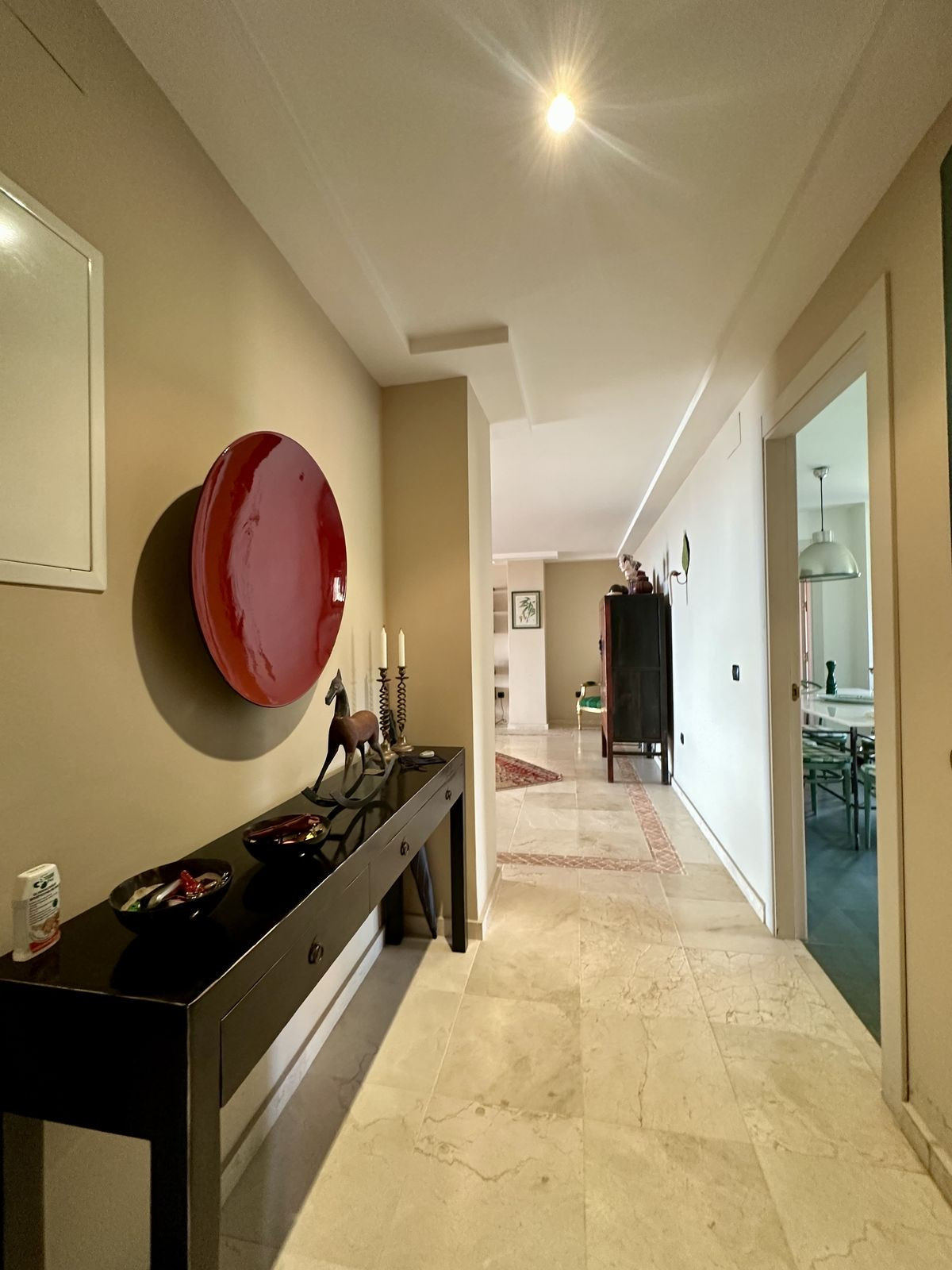 Lägenheten har ett rymligt vardagsrum med öppen spis (ca 50 kvm), ett mycket rymligt kök med möjlighet att integrera med vardagsrummet, ett master bedroom med klädkammare och eget badrum. Dessutom finns två ytterligare sovrum, alla med eget badrum och två med havsutsikt. Den utmärkta byggkvaliteten, med luftkonditionering, uppvärmning och dubbla fönster, garanterar maximal komfort. Det ingår också en garageplats inomhus och en utomhus för besökare, samt ett förråd.