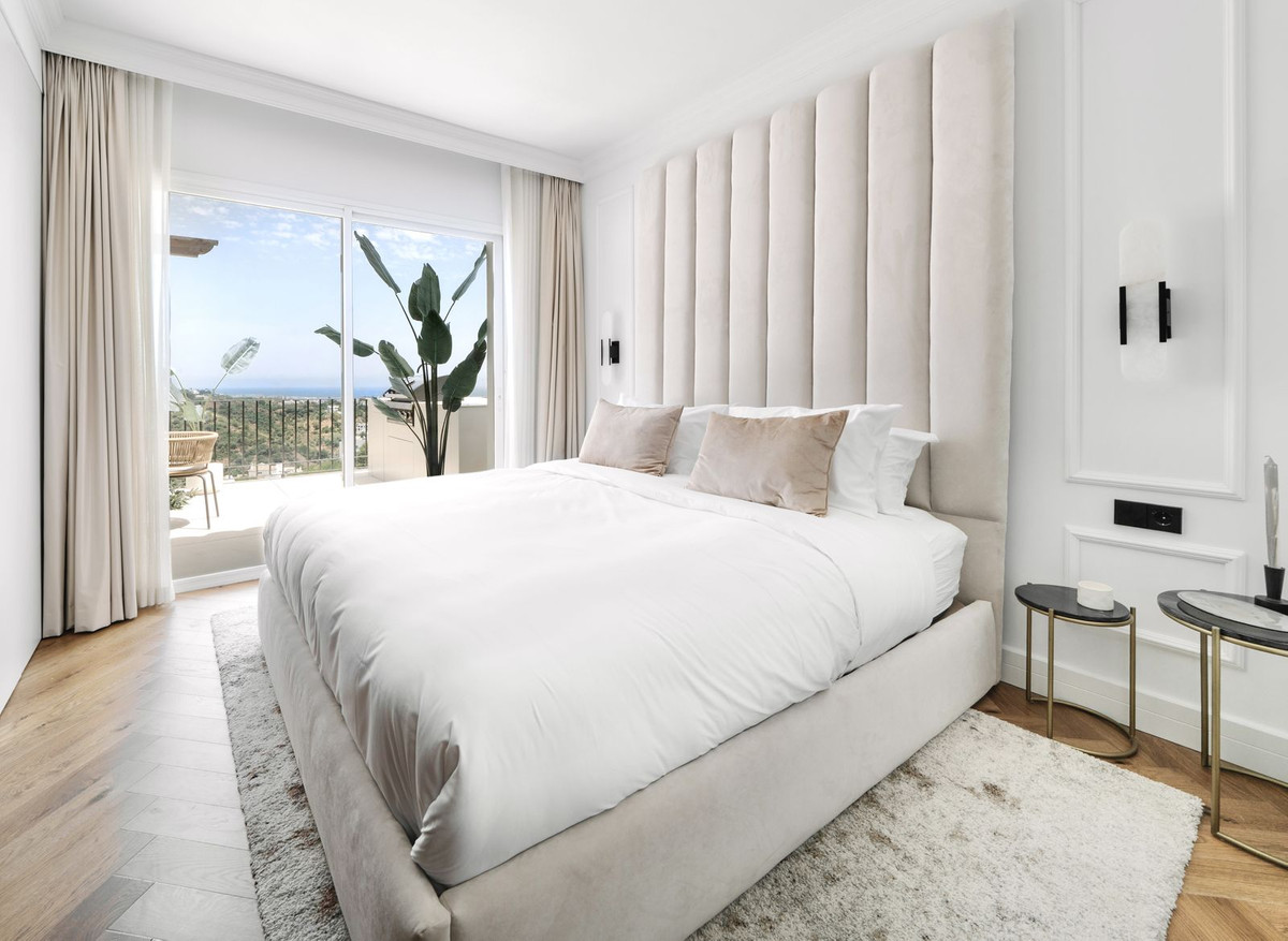 Lägenheten har ett öppet kök med Smeg-apparater och ett vardagsrum med stora skjutdörrar till terrassen med panoramautsikt över det omgivande landskapet, La Quinta Golf och Medelhavet bortom.