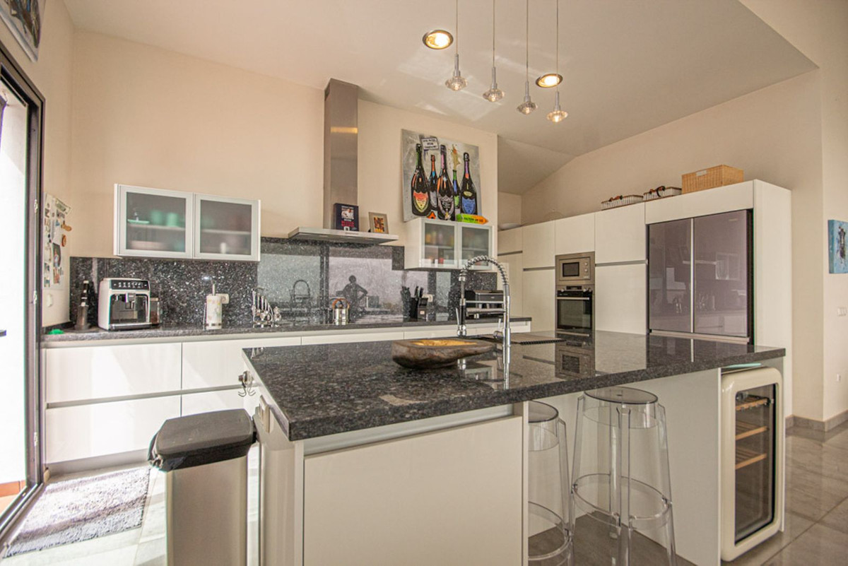 The main living area is spacious, with high ceilings, large windows, and an open-plan kitchen that flows directly onto the terraces. These terraces are perfect for enjoying outdoor dining, relaxing by the pool, or simply taking in the scenery that stretches across the golf valley of La Cala Golf, over to Coín, Mijas and Benalmádena, and even as far as the Sierra Nevada on a clear day.