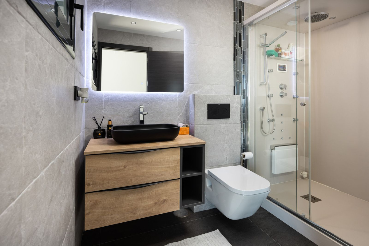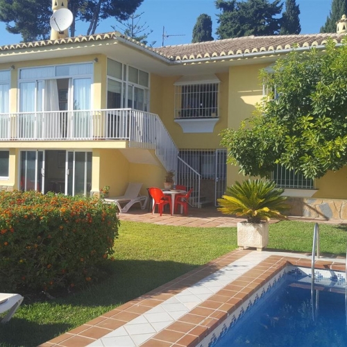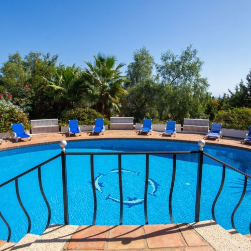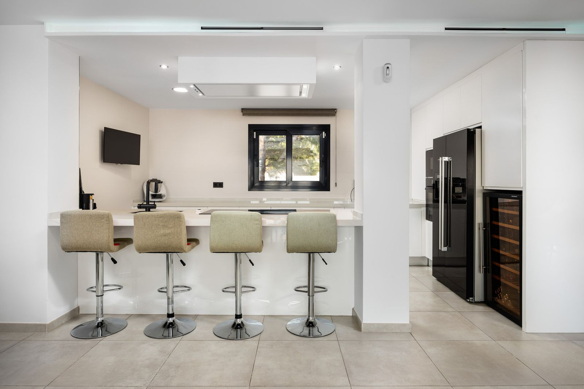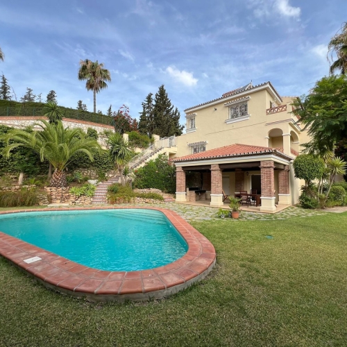 Spectacular villa that perfectly blends Mediterranean style with contemporary design, combining traditional charm with modern comfort and top-quality finishes. Located in the prestigious Buena Vista area of Mijas, it offers a unique lifestyle in a peaceful and private setting, with stunning panoramic views of the Mediterranean Sea, the coastline, Africa, and the mountains. Set on a plot of 800 m² with a built area of 251 m², the property is in immaculate condition and ready to move into. Its location is unbeatable: just 5 minutes from Fuengirola, 2 minutes from the exclusive Higuerón commercial area with all kinds of services, 10 minutes from the finest beaches of the Costa del Sol, and only 20 minutes from Málaga city center and the airport. The villa is mainly distributed on one floor, ensuring functionality and comfort. Upon entering, the home immediately stands out for its brightness and sense of space thanks to the open-plan design. The modern fully fitted kitchen seamlessly integrates with the spacious living room with fireplace, creating a warm atmosphere that connects with the terraces and garden through large sliding doors. The exterior is a true private retreat, featuring a swimming pool with sunbathing area and hydromassage jet, a barbecue area ideal for outdoor gatherings, and a landscaped garden with fruit trees, all with open views to the sea and mountains. The property offers four bedrooms. The master bedroom, with en-suite bathroom and walk-in wardrobe, has direct access to a terrace with a private jacuzzi. Two additional bedrooms with their own bathrooms are located on the opposite wing of the house, ensuring privacy for family or guests. On the upper floor, a versatile space currently used as a gym with bathroom and private terrace can easily be converted into an independent suite with spectacular views. Additional features include a cinema room, sauna, laundry room, air conditioning, solar panels for hot water, and parking space for three vehicles, including a closed garage and covered carport. An ideal residence both for year-round living and as a luxury holiday home, perfect for those seeking privacy, comfort, and a strategic location on the Costa del Sol.