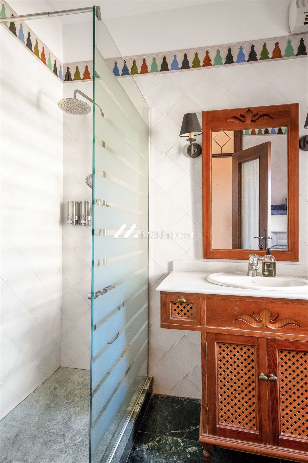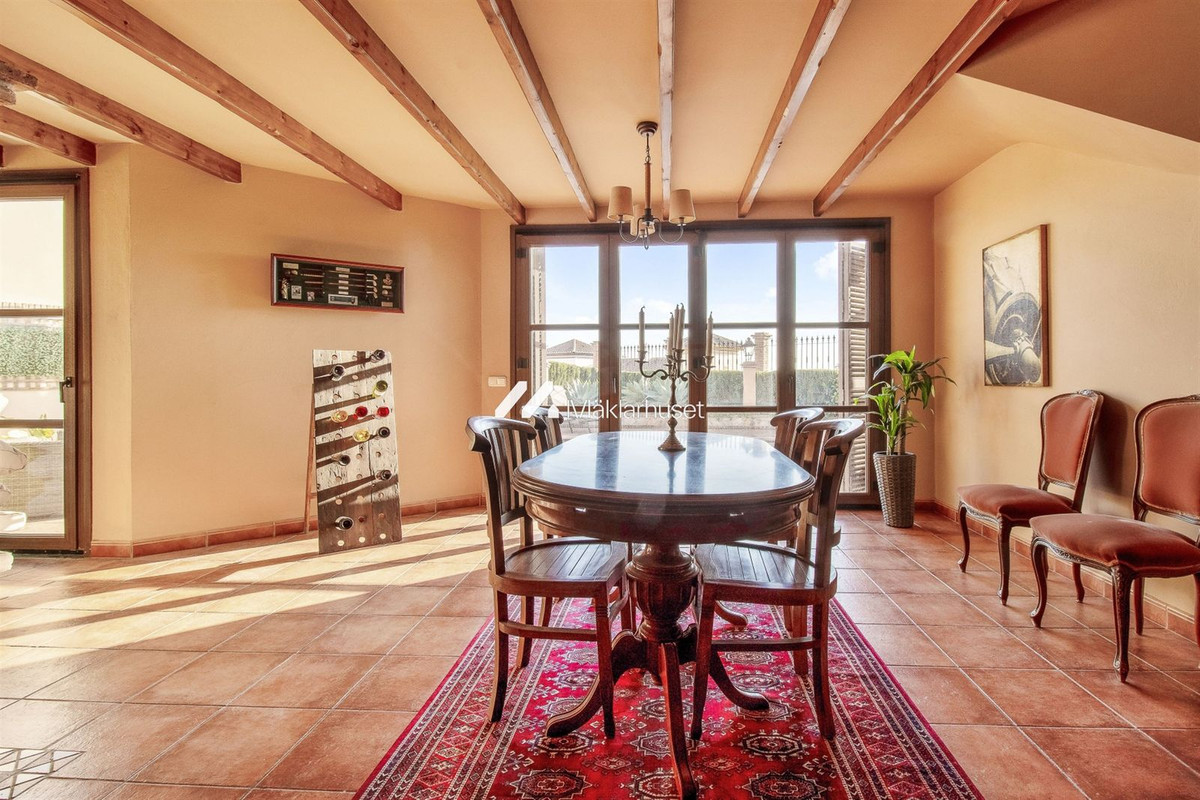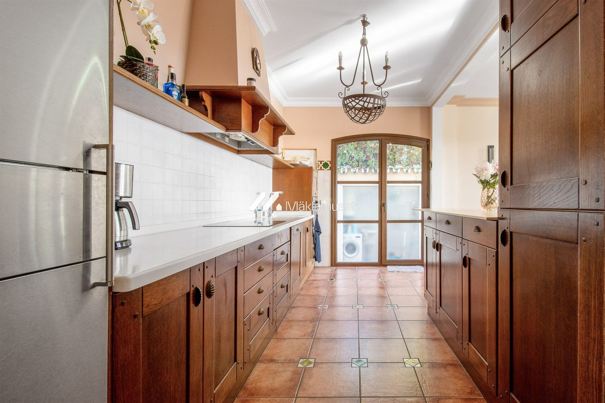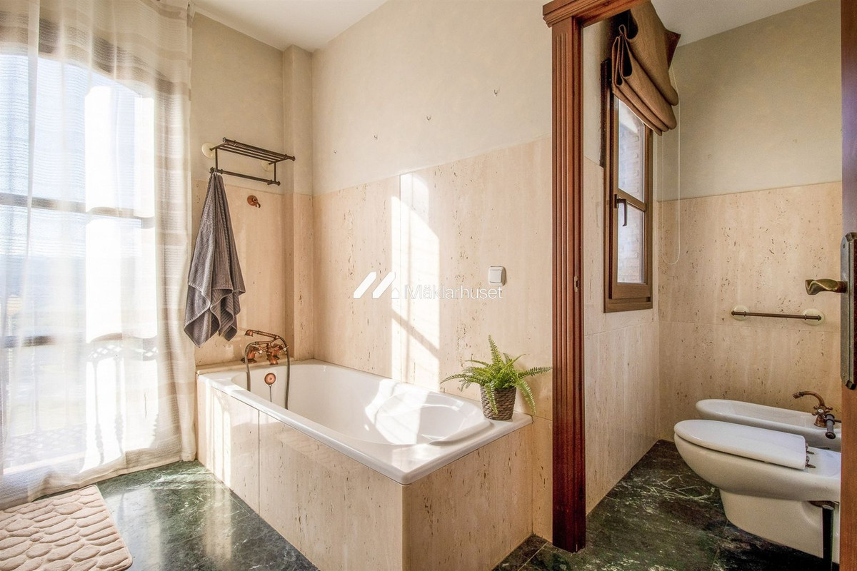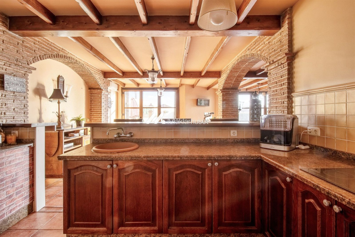 På nedre plan hittar vi ett charmigt allrum med öppen spis och ett andra kök, vilket gör denna del av huset perfekt för gäster eller som en separat yta för familjen. Allrummet har direkt anslutning till poolområdet, där du kan njuta av långa, lata dagar i solen eller ta ett uppfriskande dopp.