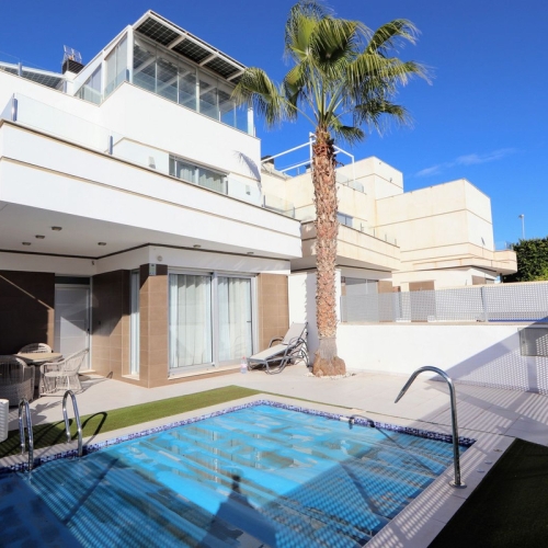 Semi-detached house in the exclusive Aldeas de Aguamarina residential area, located in Cabo Roig. The 72 m2 home features 3 bedrooms, one of them on the ground floor, 2 full bathrooms, a spacious living-dining room, and a spacious separate kitchen with an open-plan utility room.. . It features two terraces, a 34 m2 garden with a barbecue area, ideal for outdoor enjoyment, and a large sun terrace with sea views. It is sold semi-furnished and in good condition.. . The residential complex offers a beautiful communal pool and is located just steps from the sea and all amenities. Ideal as a permanent residence or as an investment for holiday rentals.