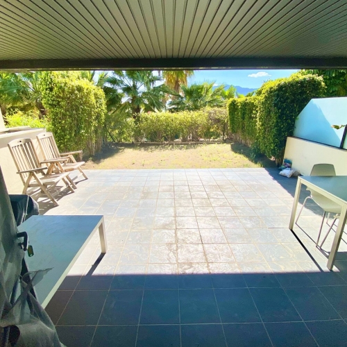 Inside, a bright living-dining room with fireplace opens onto the covered terrace and garden, creating the perfect space for both relaxation and entertaining. The fully equipped kitchen is spacious and functional. The apartment offers two bedrooms that ensure comfort and privacy; the master bedroom has direct access to the garden, allowing a seamless indoor-outdoor living experience.