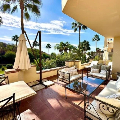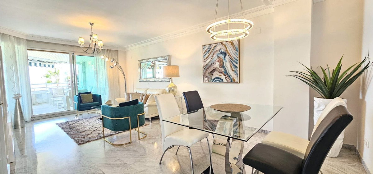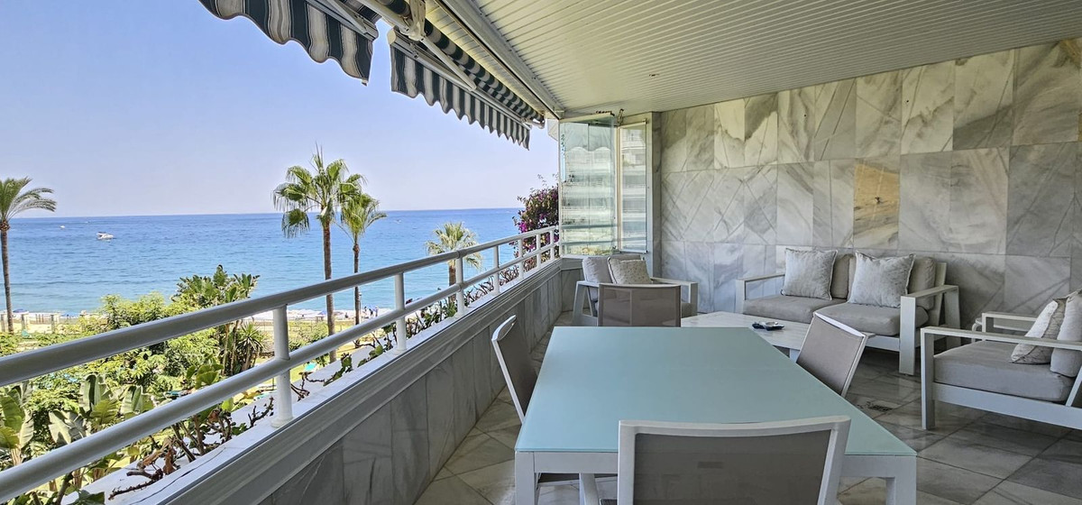 Beautiful apartment in a gated community Playa Esmeralda, located on beachfront, in Golden Mile, Marbella. The apartment has 2 bedrooms, 2 bathrooms (one in-suite), living room with access to the spacious terrace with amazing view to the sea, beach and gardens. Kitchen is equipped with all appliances. In the urbanization there is two swimming pools, beautiful gardens, gym, direct access to the beach and 24 hours security sistem with camaras.