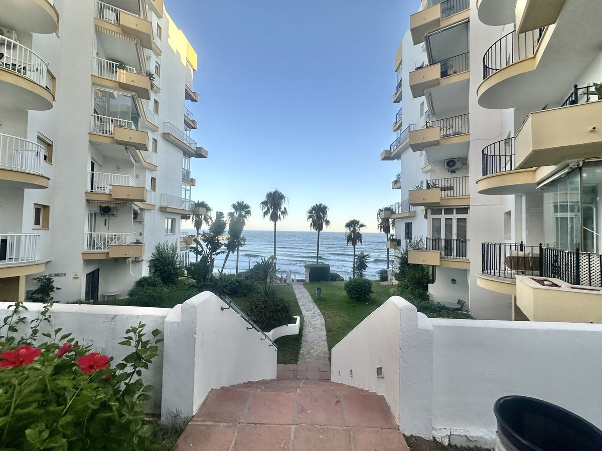 Fantastic opportunity in the sought-after Marbella del Mar complex, set directly on the beachfront and only 10 minutes' walk to Marbella Old Town. This 1-bedroom, 1-bathroom ground floor apartment offers a spacious terrace with pool views and lateral sea views, ideal to reform and create your dream coastal residence or a profitable holiday rental.