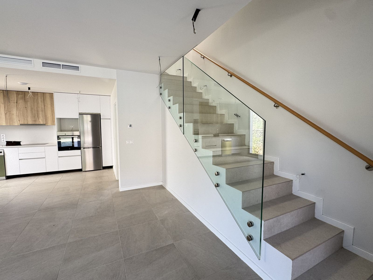 The open-plan living space connects seamlessly to the fully fitted kitchen, which comes complete with modern appliances and high-quality cabinetry. A striking staircase with glass balustrade enhances the modern design and creates a bright, airy atmosphere.
