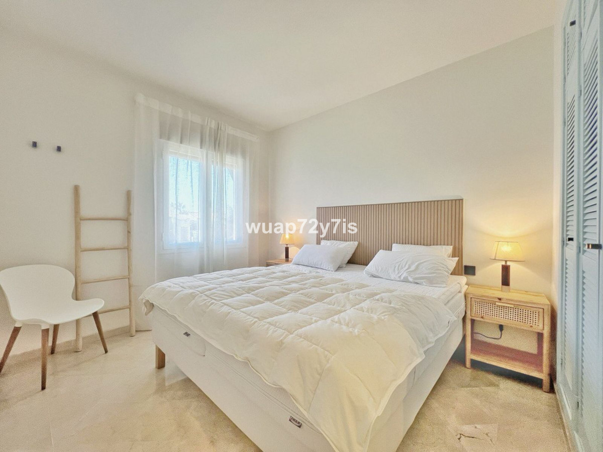 The property features two bedrooms sharing a bathroom, as well as a master bedroom with an en-suite bathroom. Parking is available within the gated urbanisation. The beach is just a 3-minute walk away.
