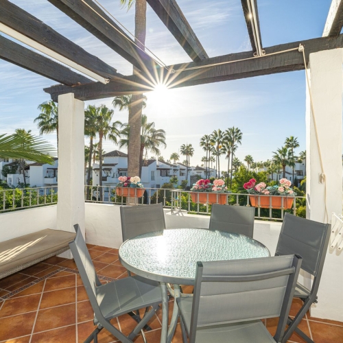 This spacious three-bedroom penthouse is located in Costalita in Estepona East. Upon entering, you are welcomed by a modern kitchen that flows into the dining area and living room, with direct access to the terrace. From the terrace, you can enjoy beautiful views of the swimming pool, which is part of the communal areas of the urbanisation.