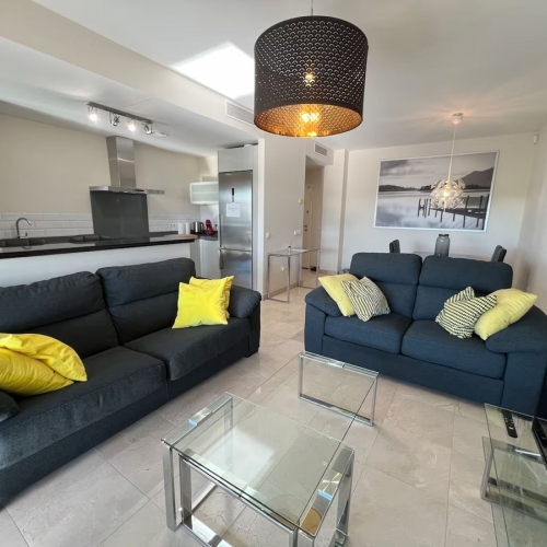 This beautifully furnished 2-bedroom apartment is located in the prestigious complex of Hoyo 19, within the exclusive Los Flamingos Golf Resort in Benahavis. The apartment offers a perfect blend of comfort and luxury, featuring hot and cold air conditioning, elegant marble floors, and a spacious master bedroom with an en-suite bathroom and fitted wardrobes. The fully fitted kitchen is ideal for preparing meals, and the property includes secure underground parking with direct lift access, providing convenience and privacy.