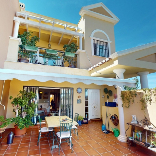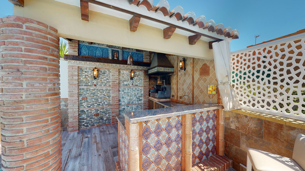 Beautiful, renovated semi-detached house in the quiet residential area of Viña Malaga. The three-storey house has two entrances. It is divided into 3 bedrooms, 3 bathrooms, a guest toilet, 2 kitchens, a living room and a home cinema. The outdoor area offers various chill-out areas, a pool, and an outdoor kitchen with barbecue. In the basement there is a double garage, which is now used as a cinema, as well as a gym, a kitchen and a guest toilet. This part can be used for entertaining friends, or as an independent apartment with 2 bedrooms. There is direct access from the garage to the ground floor. The ground floor has an entrance hall with a wardrobe, a bathroom with a shower, a kitchen with all modern appliances and an exit to the balcony, and a living and dining room with a fireplace. From the living room there is also an exit to the beautiful outdoor area. There you will find the large patio with many seating and lounging areas around the 4 x 8 m pool, an outdoor shower and stylish decorations. There is also a rustic bar and a barbecue area with water and electricity. In the evening, everything is romantically lit and you can enjoy wonderful meals with family and friends. On the first floor are the three bedrooms, one of which has a dressing room and on-suite bathroom. Each bedroom has its own balcony with sea views. The house was built in 2002 and was recently renovated. Don't miss the opportunity to visit this beautiful semi-detached house, which is only 5 minutes away from the beach, the motorway and the golf course. We are pleased to be able to present this dream property to you soon, either personally or via virtual viewing. Because this world is unique - just like our Axarquía. In Andalusia. On the Costa del Sol. Here, on the sunny side of life...