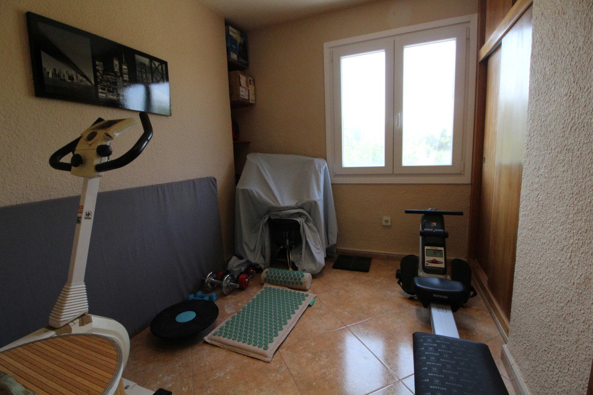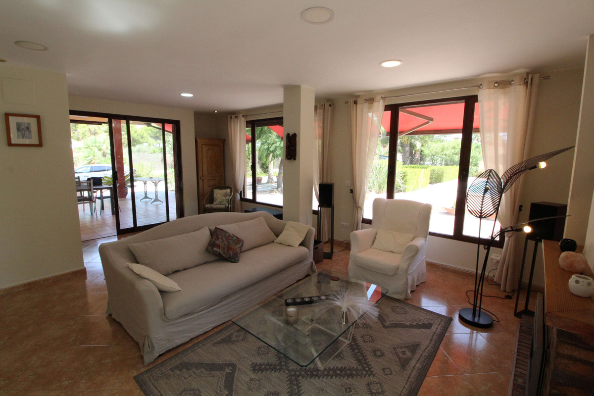 The property itself is of fairly modern design with a good quality build and architectural design of a traditional Finca of the area. The interior has a contemporary layout which flows nicely from the entrance on the main terrace you walk into the lounge with log burner insert in the fireplace and air conditioning, enough comfortable seating for a large family and then further back closer to the kitchen is the dining area. The kitchen is separate and includes all appliances and a utility room with a door leading out to the terrace. On this floor down the hallway there are 2 double bedrooms and a bathroom with shower/tub. The stairs leading upstairs from the lounge lead to 4 more bedrooms including the master bedroom and another family bathroom with walk in shower. From the master there is access to a large solarium overlooking the garden. One of the bedrooms is set up as a small gym but can also be used as an office.  All bedroom have AC units and built in wardrobes.