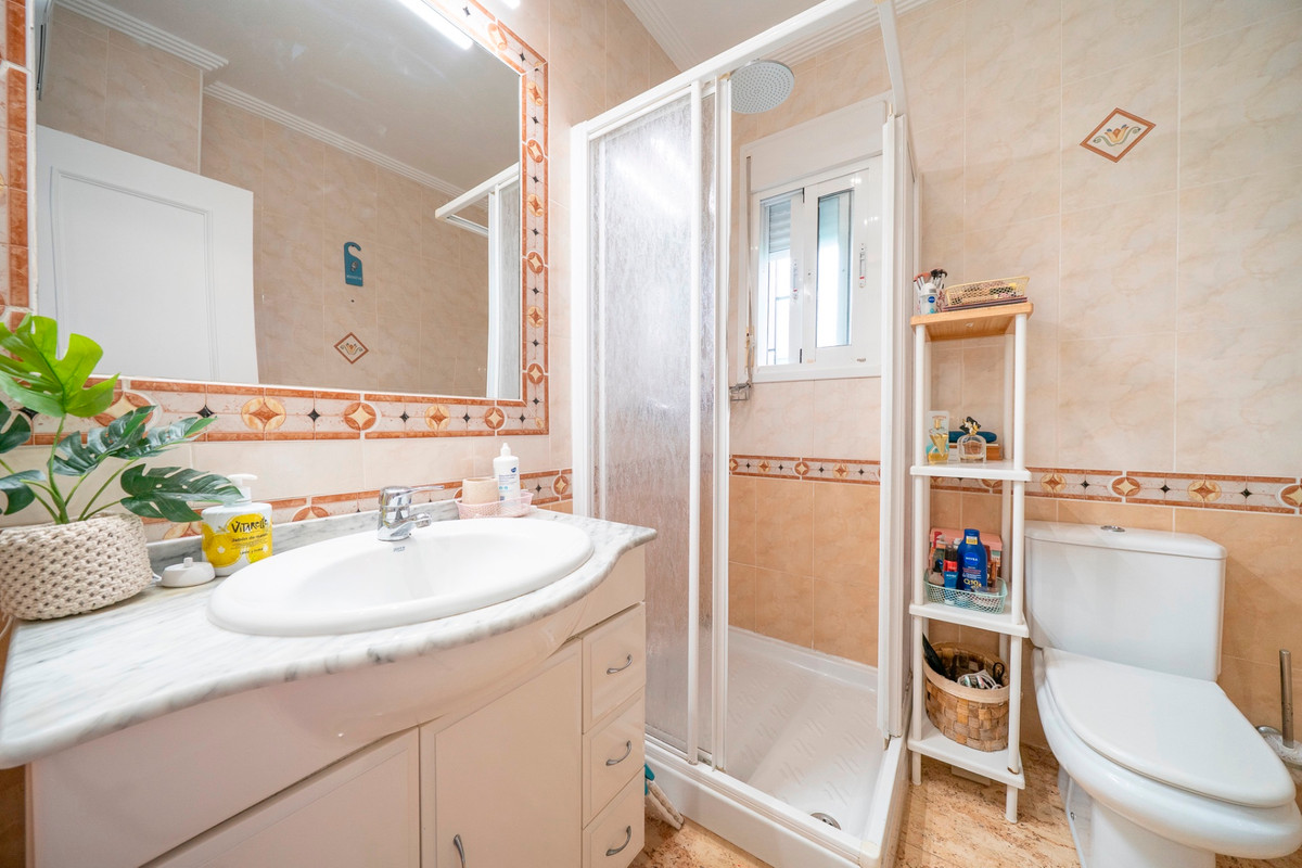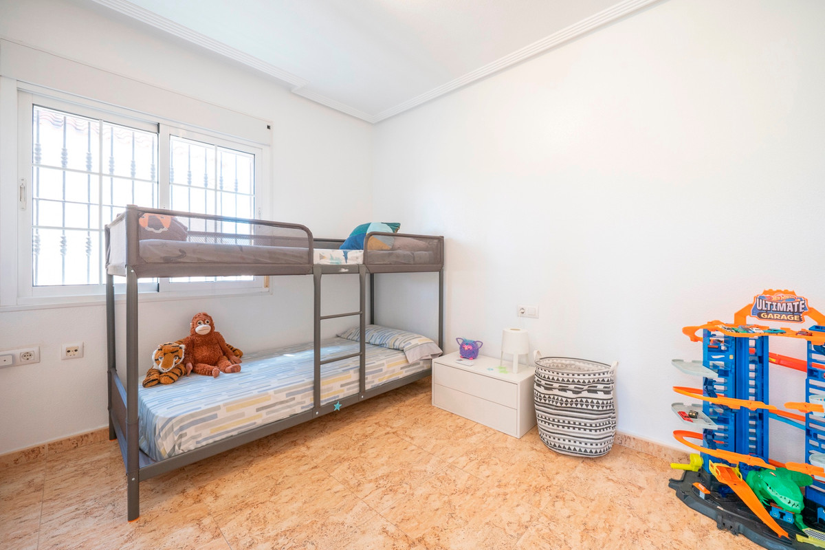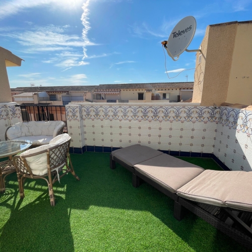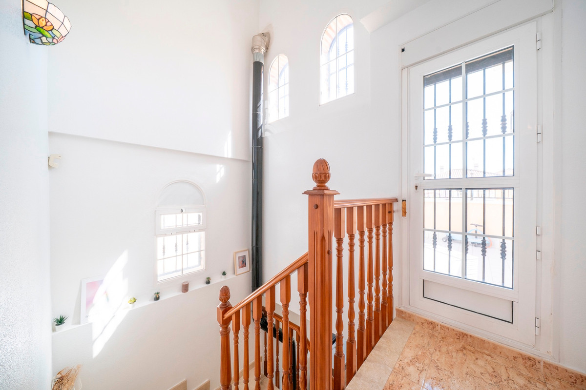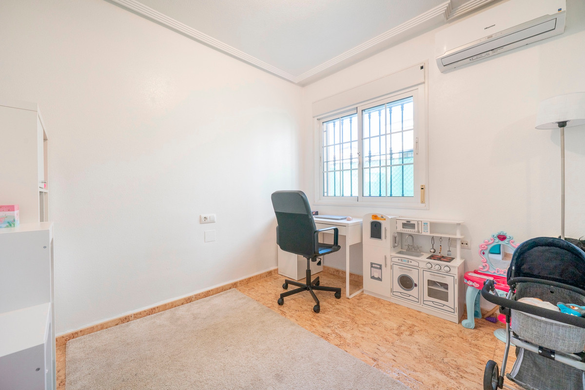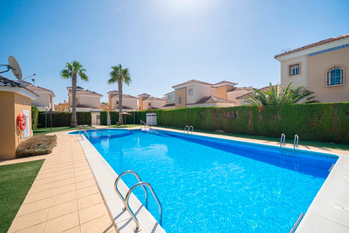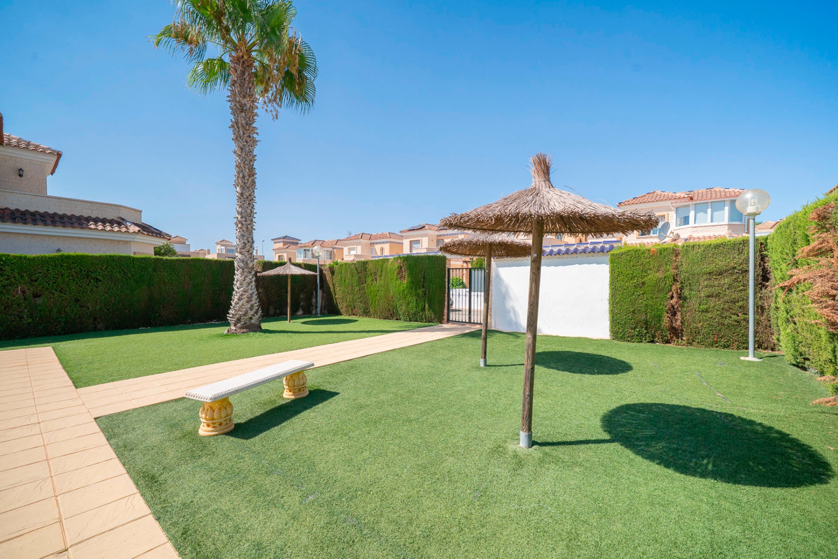 The exterior surrounds the entire house, and at the front, there is a cozy wooden pergola that invites you to enjoy meals and family gatherings sheltered from the sun. The property also has a back door that connects directly to the road where the entrance to the community pool is located, offering convenience and quick access to the common area.