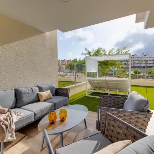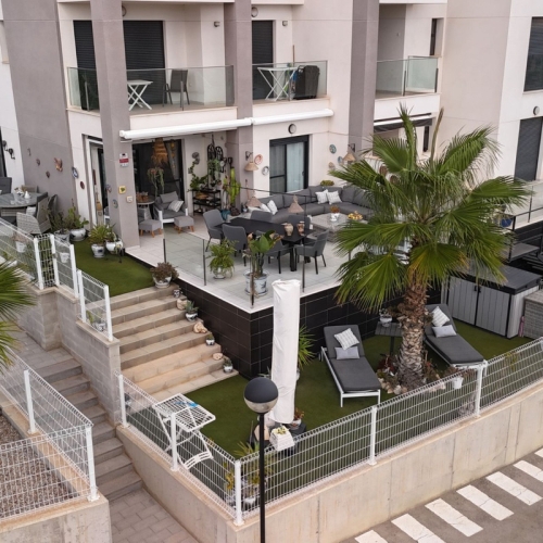 We present this charming ground floor apartment located in the sought-after residential complex Las Violetas, just steps away from the famous Villamartín Plaza and golf course.