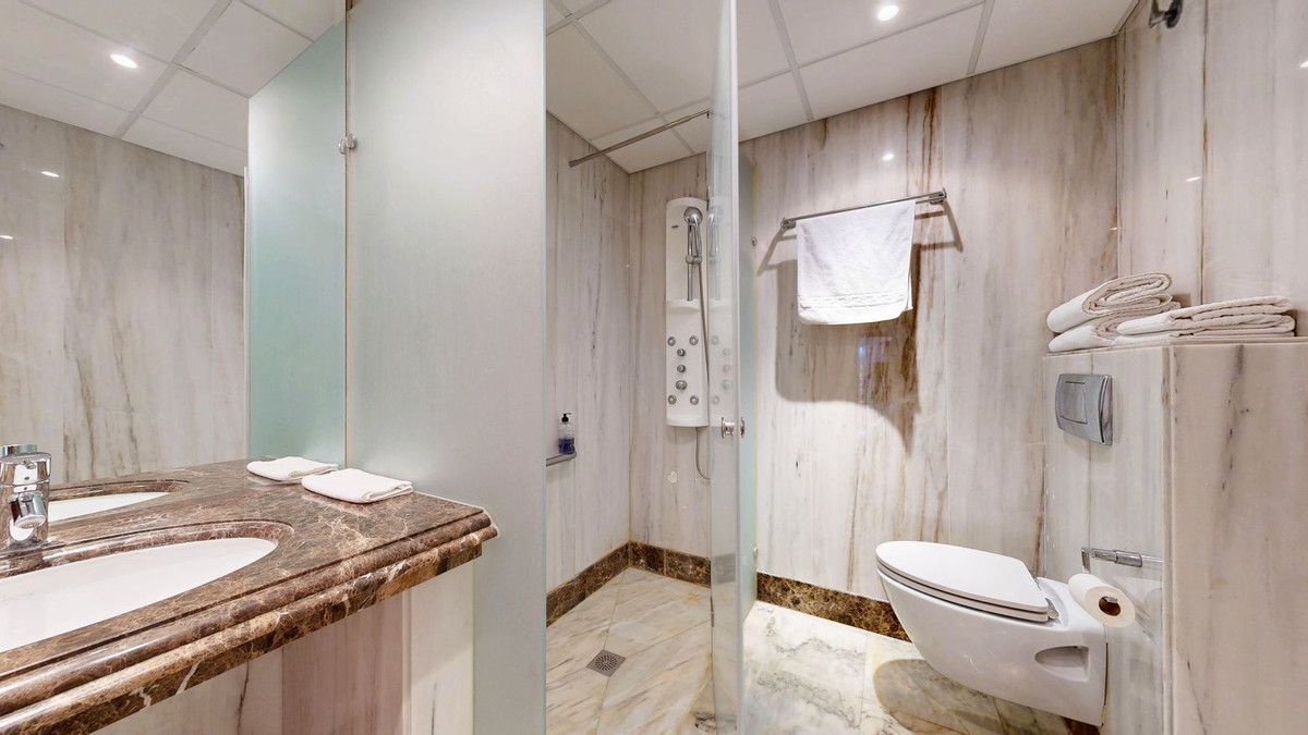 This spacious two-bedroom, two-bathroom apartment offers a bright and functional design that opens onto a large south-facing terrace with direct views of the Mediterranean. Every corner has been conceived to convey spaciousness and well-being, integrating indoor and outdoor living in a natural way. Here, days begin with the sun streaming through the floor-to-ceiling windows and end with the sea breeze as your companion.