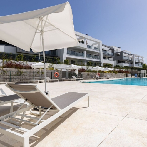 Beautiful 90 m2 apartment with 2 bedrooms and 2 bathrooms, a terrace with garden views, and direct access to the beach in an exclusive Estepona development.