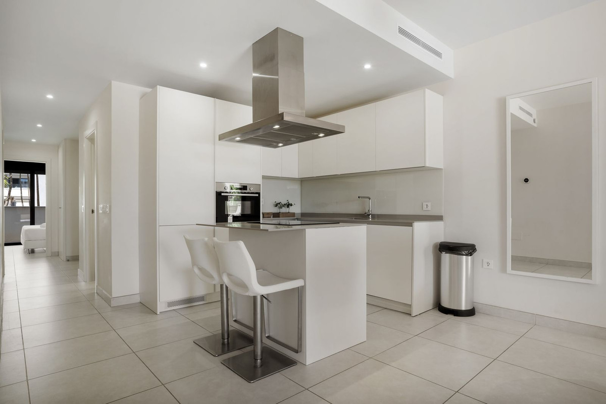 At the front of the apartment is the living room with a lovely open kitchen. From the living room, you can enter the terrace, and beautiful sliding doors that disappear into the wall make the terrace accessible.