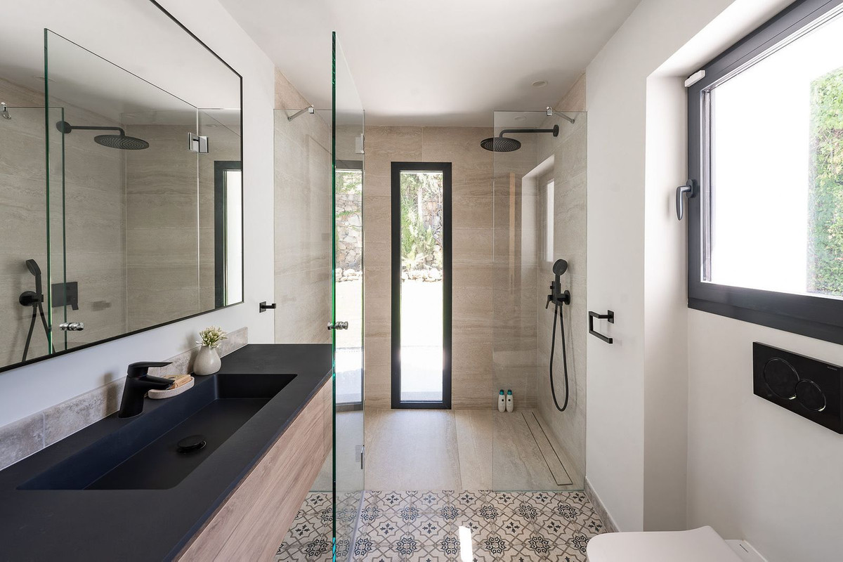 The master suite upstairs includes a walk-in wardrobe, private terrace, and a spacious ensuite with bath and shower. The rooftop terrace offers panoramic views and sea glimpses.