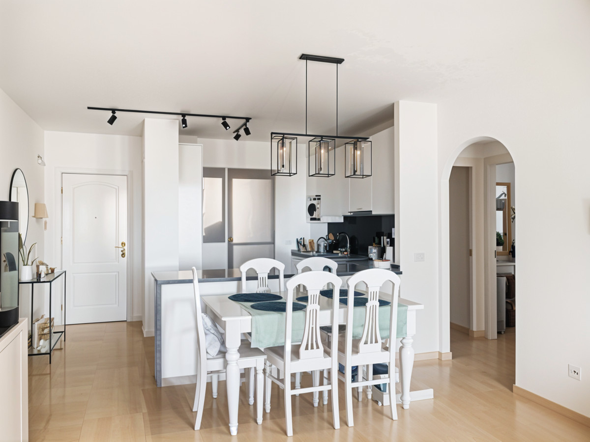 The apartment stands out for its two private terraces: one accessible from the living room and the master bedroom, and another from the second bedroom. These outdoor spaces provide the perfect setting for relaxation or entertaining guests. The main living room is a welcoming space featuring a newly refurbished fireplace that creates a warm and pleasant atmosphere. The partially renovated kitchen includes a modern peninsula opening onto the living room, enhancing interaction and flow between spaces, while a separate laundry room adds extra functionality. From the living room, you step out onto one of the terraces overlooking the communal garden.