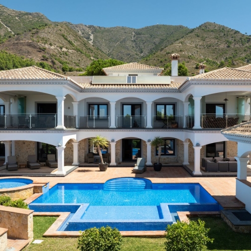 Designer villa with two distinct areas. One of them houses the living room, dining room, and social area with a large porch and access to the pool. On the upper floor, the master bedroom with a dressing room, bathroom, and terrace with mountain views.