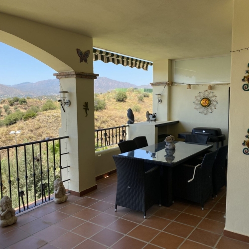 Between the whitewashed charm of Mijas Pueblo and the golden beaches of Fuengirola, this stylish 2-bedroom, 2.5-bathroom duplex offers the perfect Costa del Sol lifestyle. Bright and welcoming, the living room opens onto a spacious terrace with direct access to the pool, surrounded by lush gardens and open views of the Mediterranean.