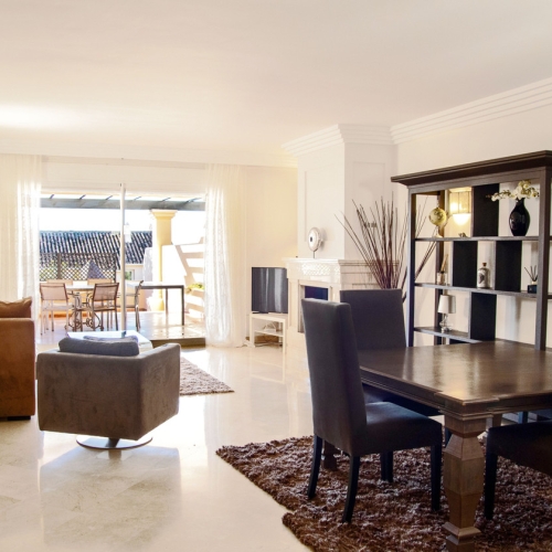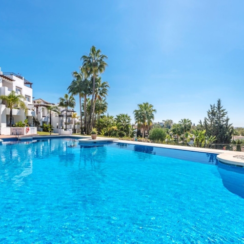 Welcome to this newly renovated duplex ground floor apartment in the heart of Nueva Andalucia, Marbella.
