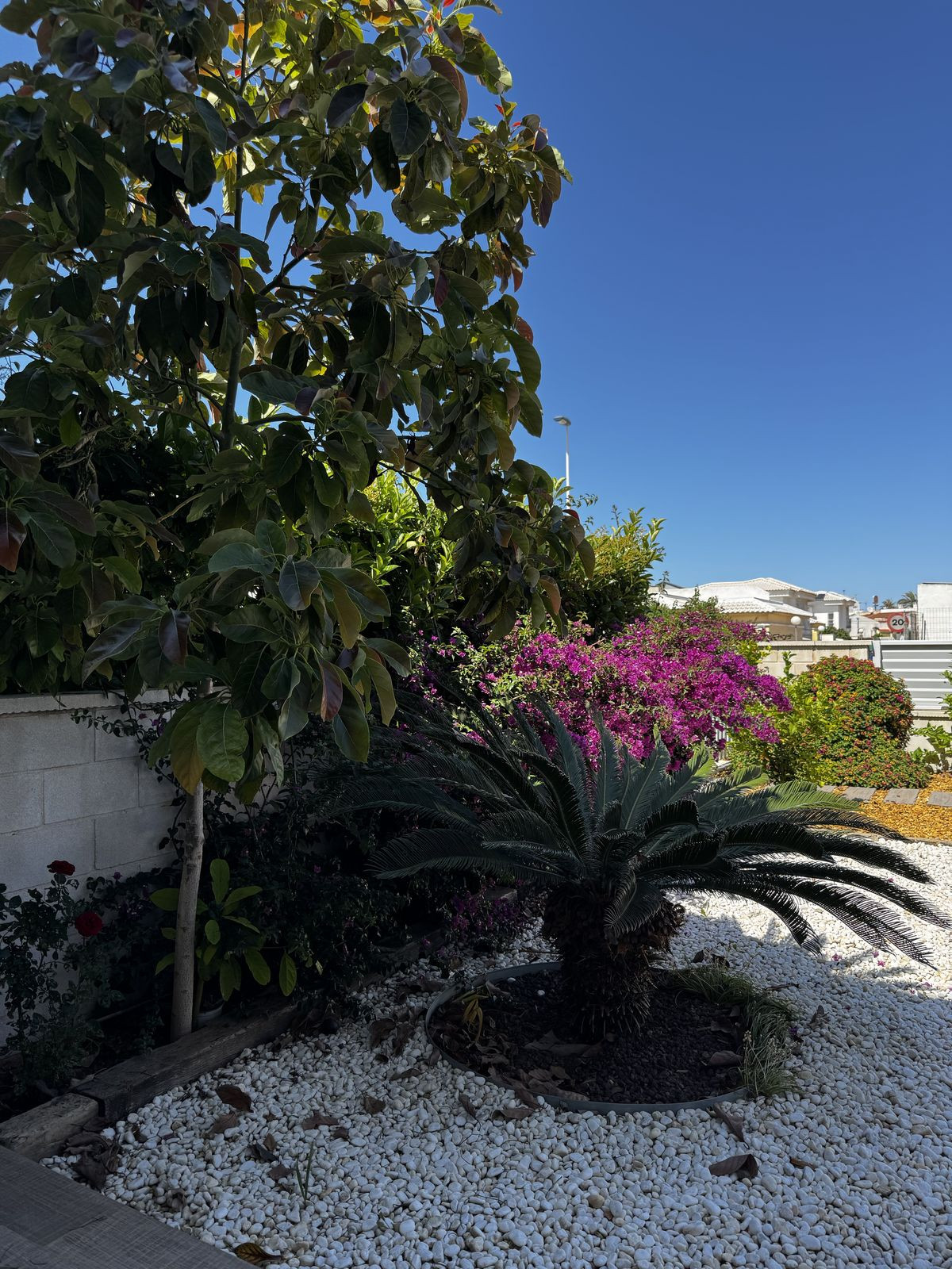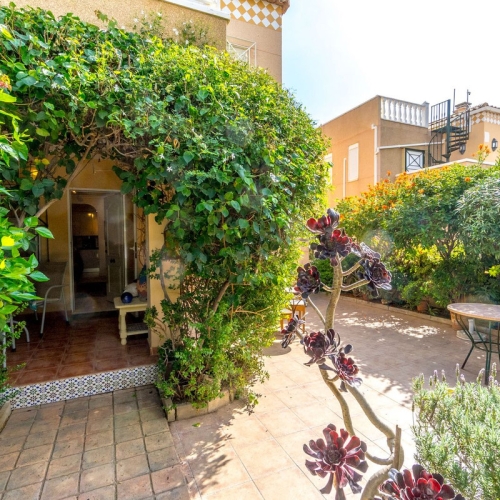 The property offers 93.10 m² built (80.75 m² usable) and sits on a plot of 104.78 m², featuring a beautiful garden with decorative plants and a spacious 50 m² terrace, ideal for enjoying the Mediterranean lifestyle.