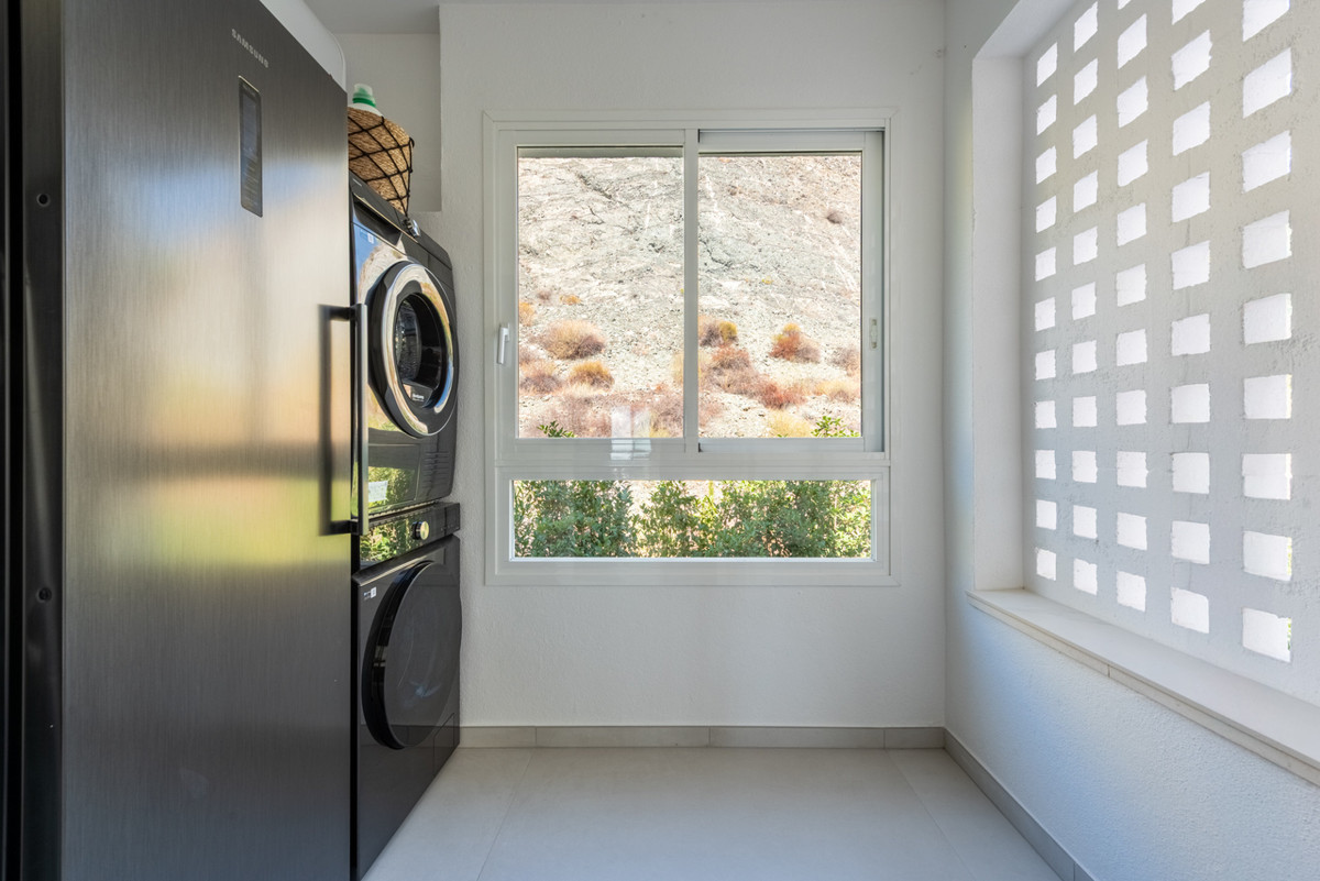Den minimalistiska, skandinaviska designen möter material av högsta kvalitet och en sober färgsättning som förstärker den ljusa och luftiga känslan. Det fullt utrustade köket är utrustat med vitvaror från Samsung och bostadens generösa ljusinsläpp skapar en välkomnande atmosfär, perfekt både som semesterbostad och för permanent boende.