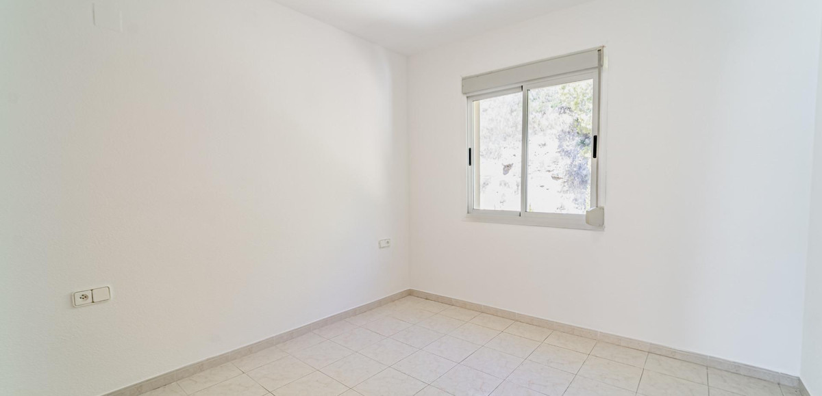Den här lägenheten är en del av ett bostadsområde med 200 bostäder som ligger cirka 10 minuter från centrala Calpe och havet. Lägenheten har ett rymligt sovrum, ett komplett badrum, ett halvöppet kök och ett vardagsrum/matrum. Från vardagsrummet kommer man ut till en stor balkong med imponerande utsikt över havet och klippan.
