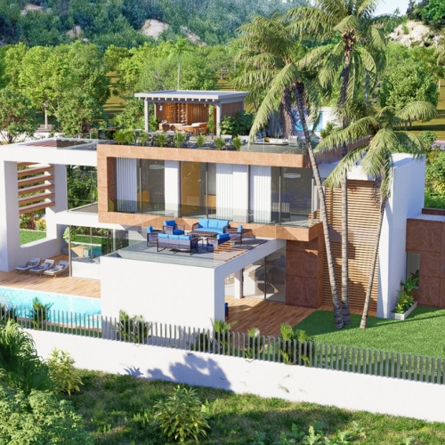 This 6-bedroom, 5-bathroom villa sits on a generous plot of over 1,000 m² with a built area of 383 m², plus an additional 150 m² of terraces. Enter through impressive iron doors into a spacious and bright living room, beautifully designed with bespoke interiors and floor-to-ceiling windows that flood the home with natural light.