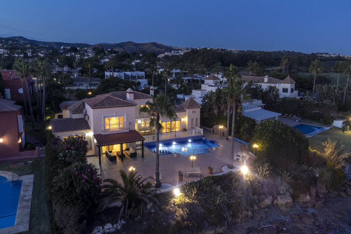 From the moment you arrive, the property impresses with its <strong>long landscaped driveway</strong> leading to the entrance. Inside, you'll find <strong>five spacious bedrooms</strong> (four en-suite), a <strong>split-level lounge and dining area</strong>, a <strong>separate kitchen</strong> and utility room and generous <strong>terraces and patios</strong> surrounding a large swimming pool. There is also a large ancillary lounge overlooking the pool giving you a separate lounge for children or guests to make use of. The <strong>master suite</strong>, occupying the entire first floor, is exceptionally large, offering panoramic sea views, ample wardrobe space, and a luxurious en-suite bathroom. A <strong>separate double garage</strong> and beautifully <strong>floodlit gardens</strong> complete the home.