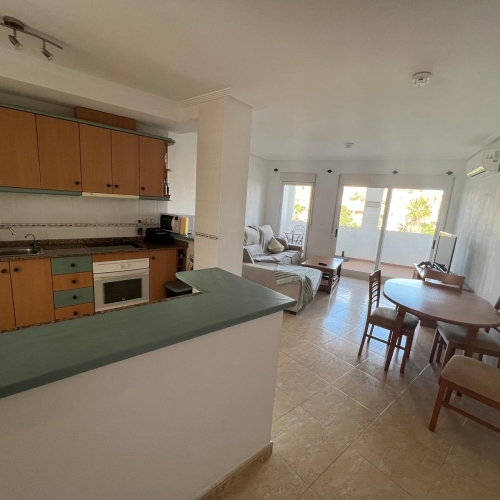 Ready to move into this beautiful, fully renovated first-floor apartment with 2 bedrooms, located just 300meters from the Aquamarina – Dehesa de Campoamor Beach. This modern apartment has70 m² and consists of 2 bedrooms with fitted wardrobe,1 modern bathroom with shower, spacious and bright living / dining area with a large sliding door that opens onto a 12 m2 sunny balcony overlooking the community green area, making it the perfect place to relax, have breakfast, or watch the sunrise over the Mediterranean Sea and as well as a independent fully equipped kitchen with utility area.