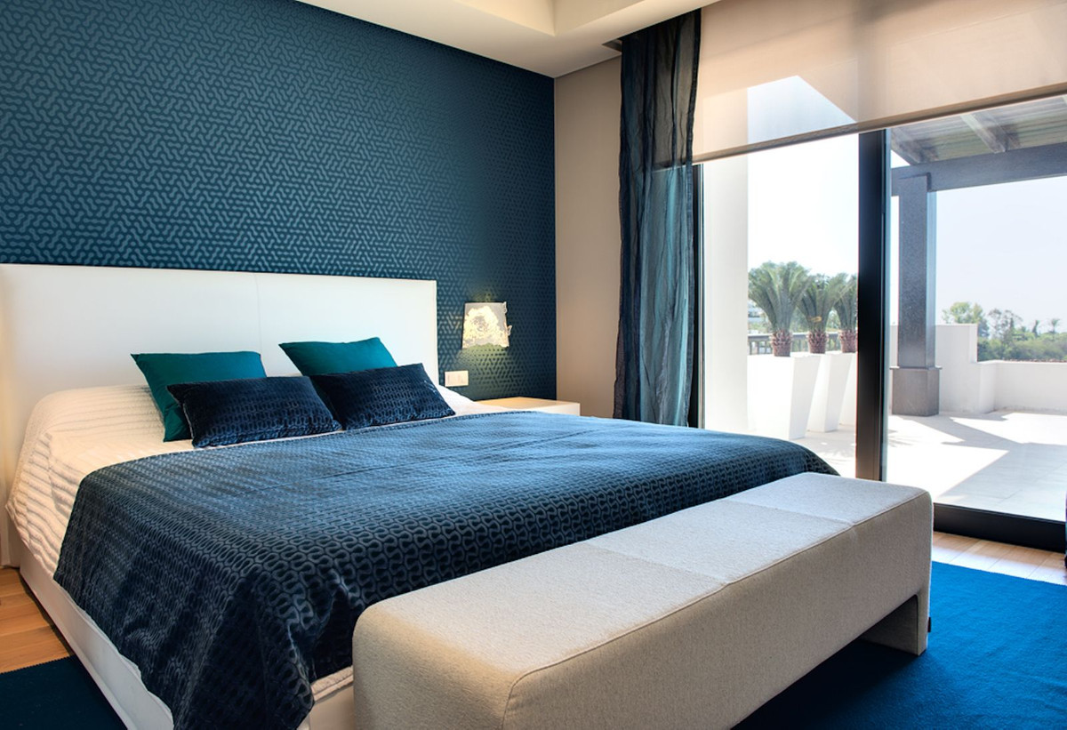 Bottenvåningen har ett ljust vardagsrum med terrass, ett fullt utrustat kök, matsal och gästsvit. På nedre våningen finns master-sviten med klädkammare och terrass, tre ytterligare gästsviter, tvättstuga och dubbelgarage. Takterrassen har en jacuzzi med panoramautsikt över havet och bergen.