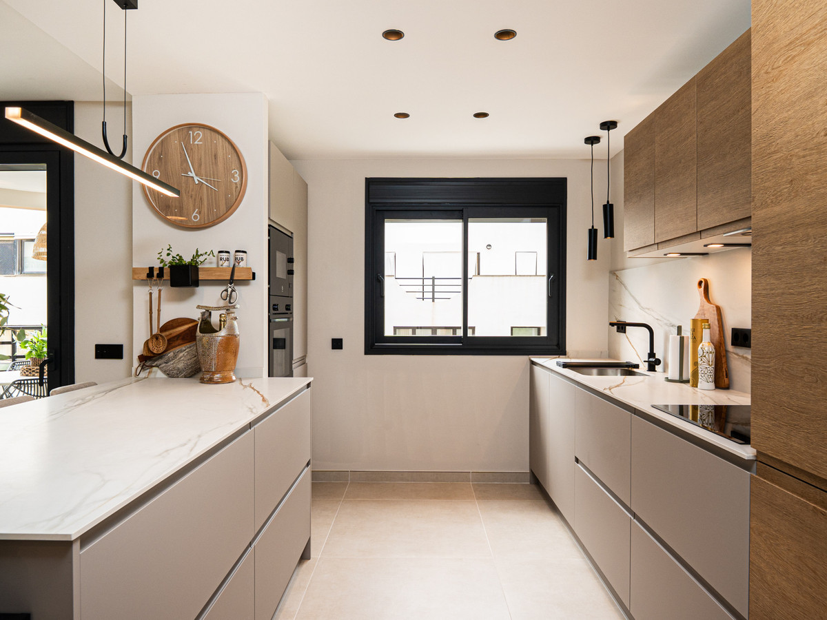 The open-plan kitchen connects smoothly to the living and dining areas, creating a spacious and welcoming environment. Premium appliances, generous storage, and a sleek breakfast bar make the kitchen both functional and stylish. Sliding doors open to a private terrace, perfect for outdoor dining or relaxing in the afternoon sun. The apartment's neutral tones, natural textures, and clean lines create a calm and sophisticated atmosphere throughout.