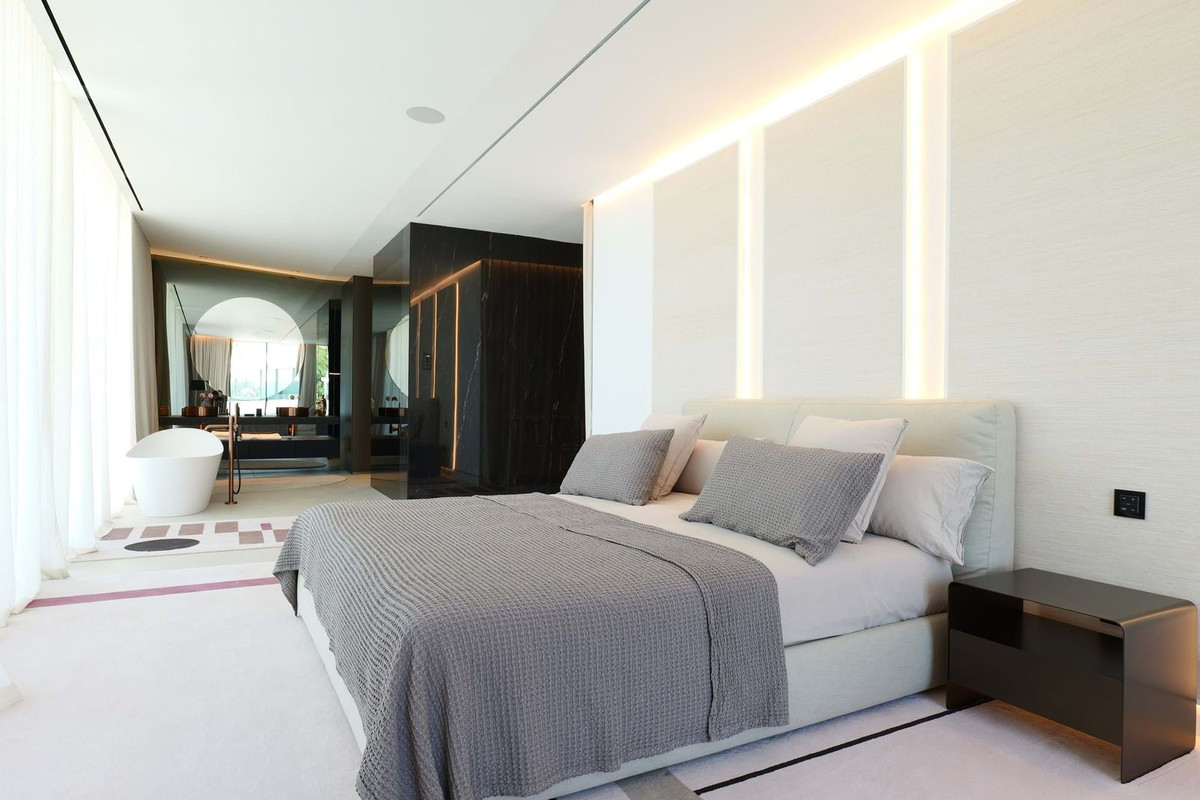 The villa features five spacious bedrooms, each with an en-suite bathroom and private terrace. The primary suite stands out as a true sanctuary with a walk-in closet and abundant natural light.