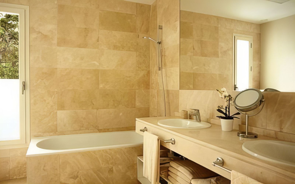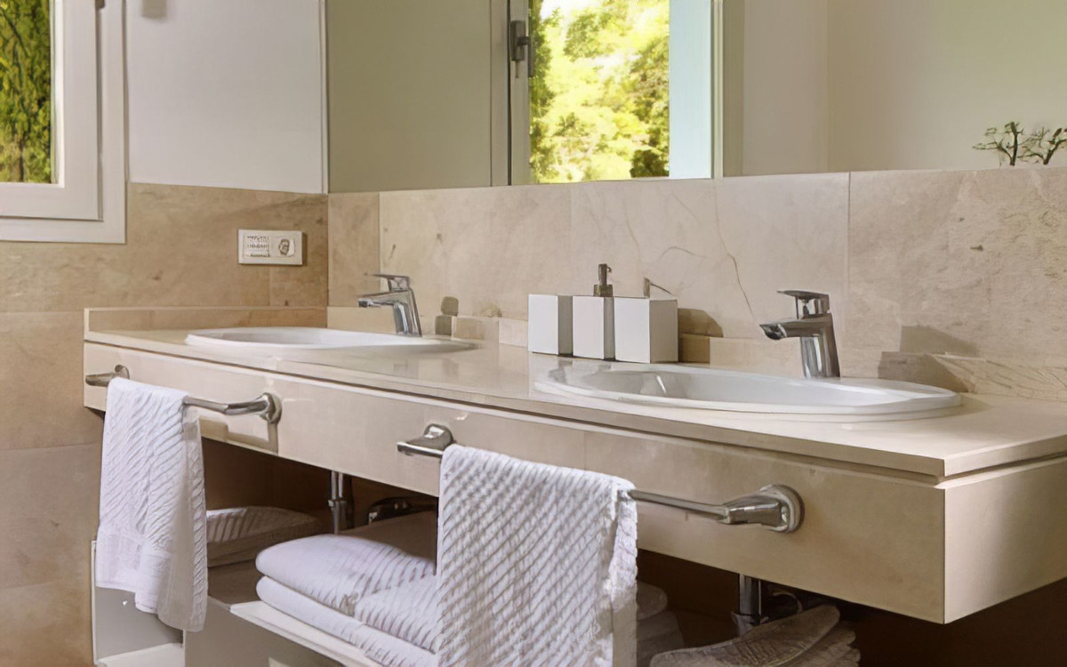 * The villa boasts beautiful cream-colored marble floors and benefits from underfloor heating. All rooms can be air-conditioned by cooling or heating.