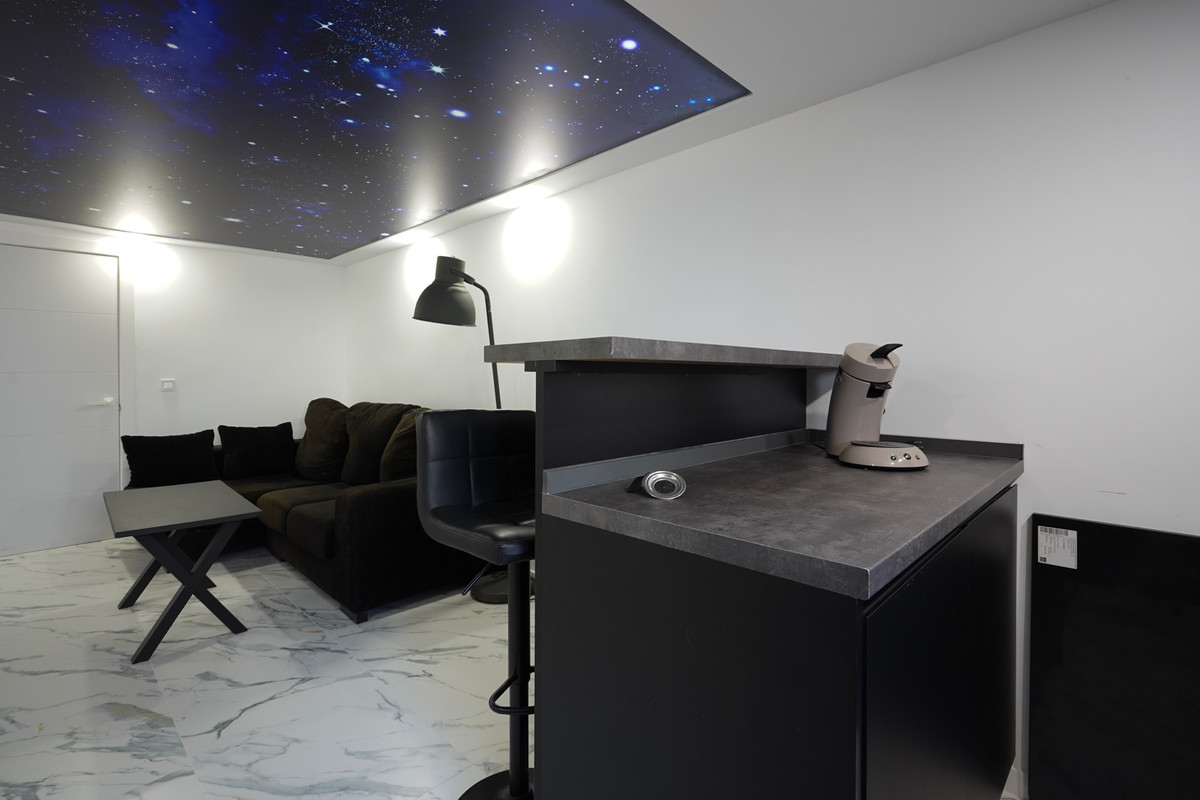 The upper floor features a modern living and dining room with fireplace, a fully equipped kitchen, two spacious bedrooms, a dressing room and a luxurious bathroom with double shower and bathtub. The living room opens onto a large south-facing terrace with stunning views over Calpe and the Peñon de Ifach. The kitchen opens onto a covered terrace, ideal for outdoor dining all year round.