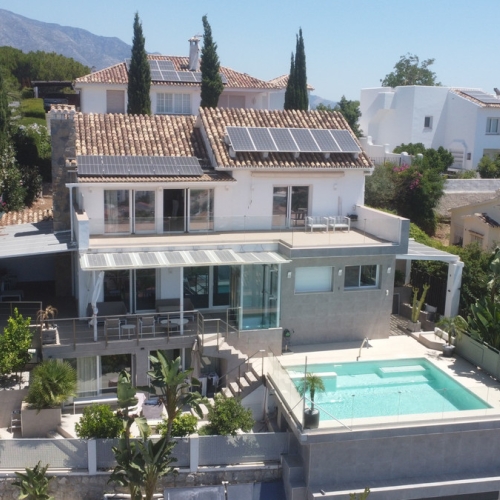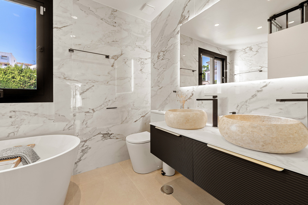 Outside, the property continues to impress. A landscaped terrace embraces the villa, offering versatile spaces for lounging in the sun, dining al fresco, or hosting barbecues with friends and family. The private swimming pool invites you to enjoy refreshing dips during warm summer days, while the rooftop terrace offers a more elevated experience—perfect for evening cocktails, stargazing, or simply admiring Marbella's spectacular sunsets.